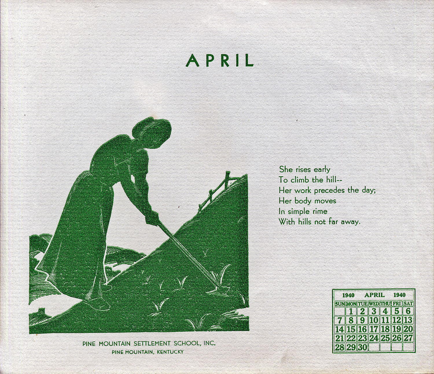 - 1940 Calendar. Linoleum prints by John Spelman III. April