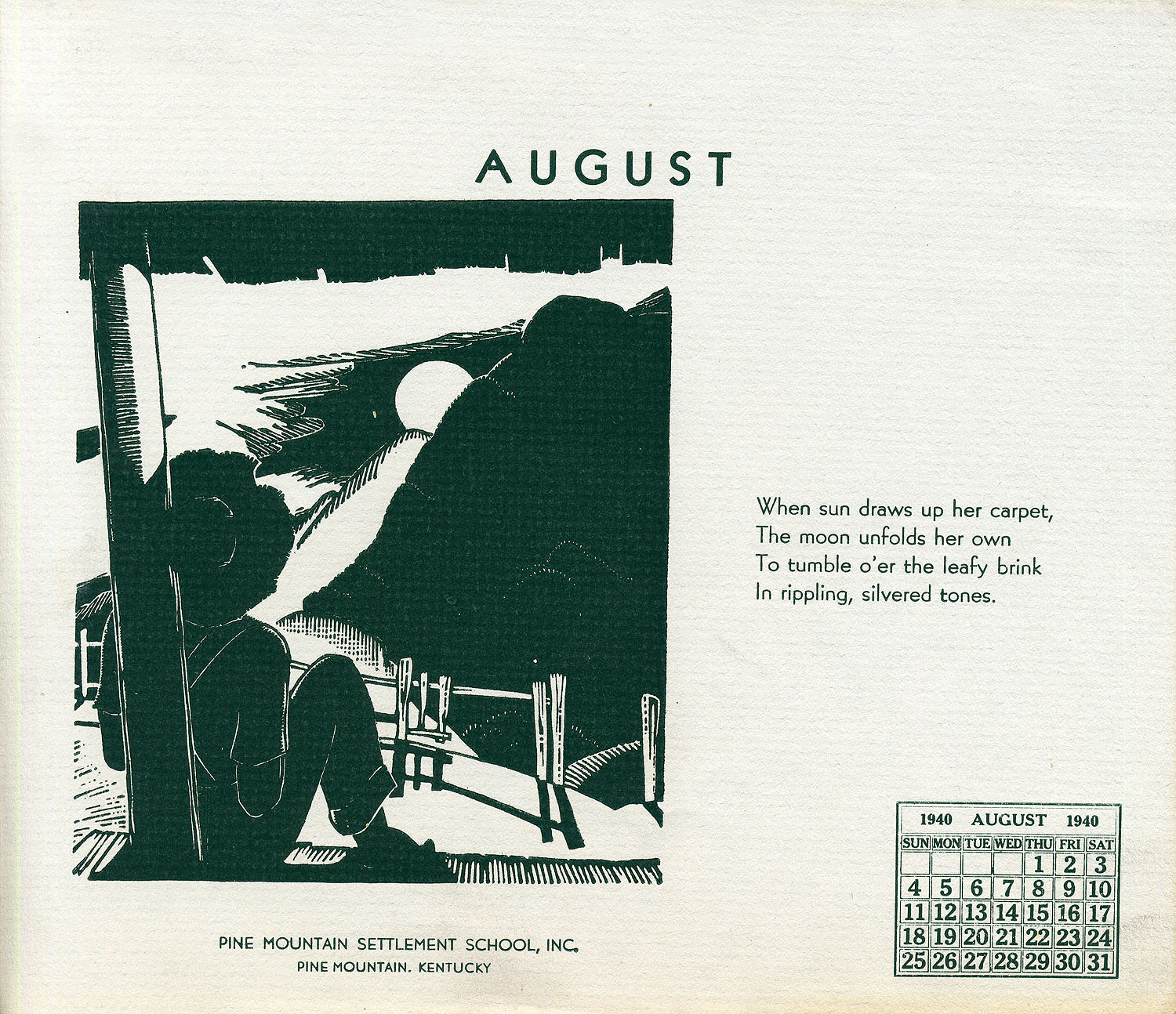 - 1940 Calendar. Linoleum prints by John Spelman III. August
