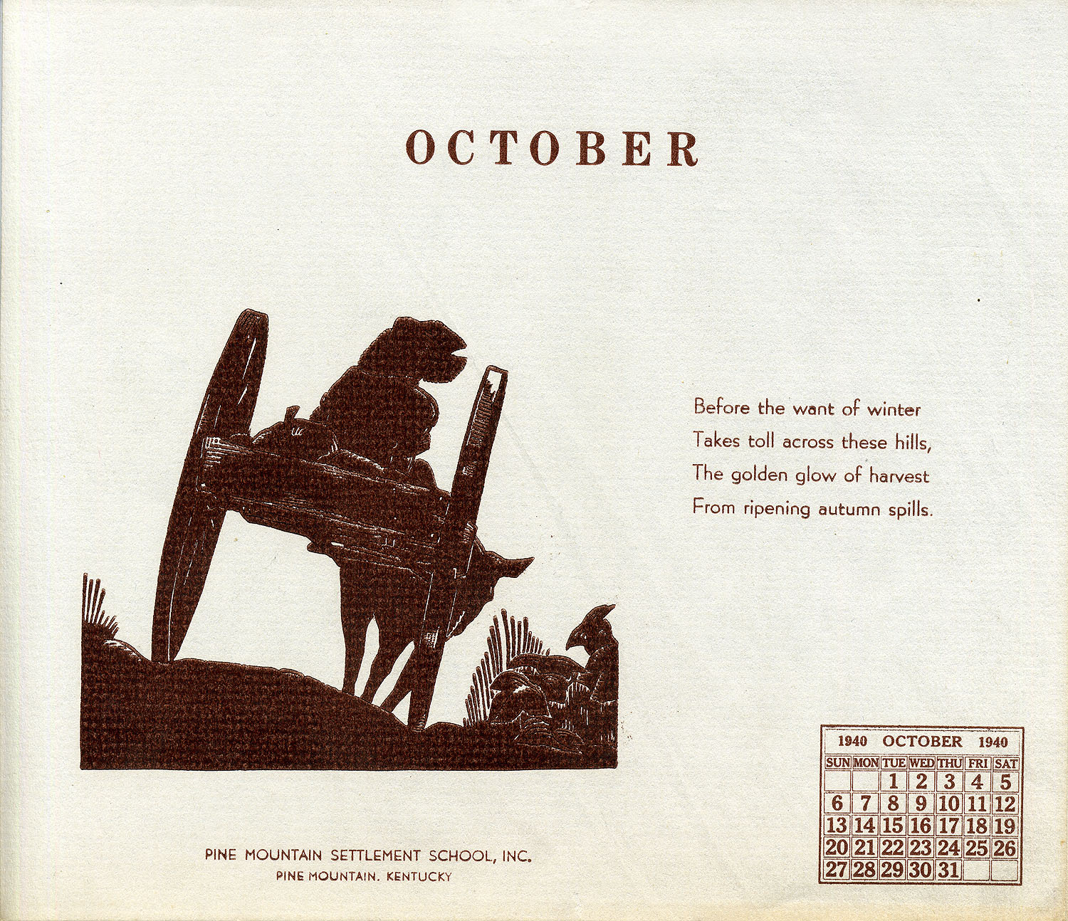- 1940 Calendar. Linoleum prints by John Spelman III. October
