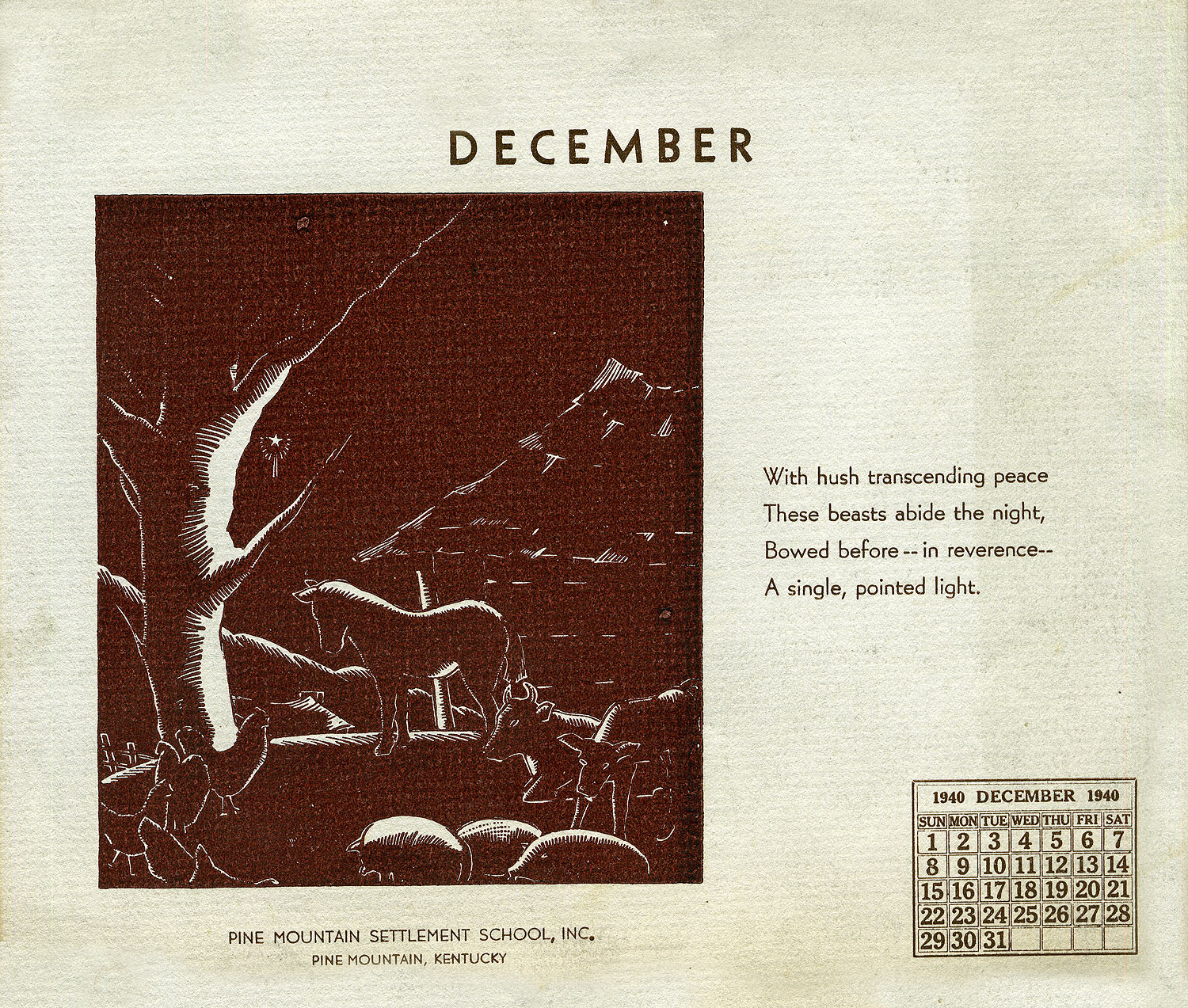 - 1940 Calendar. Linoleum prints by John Spelman III. December