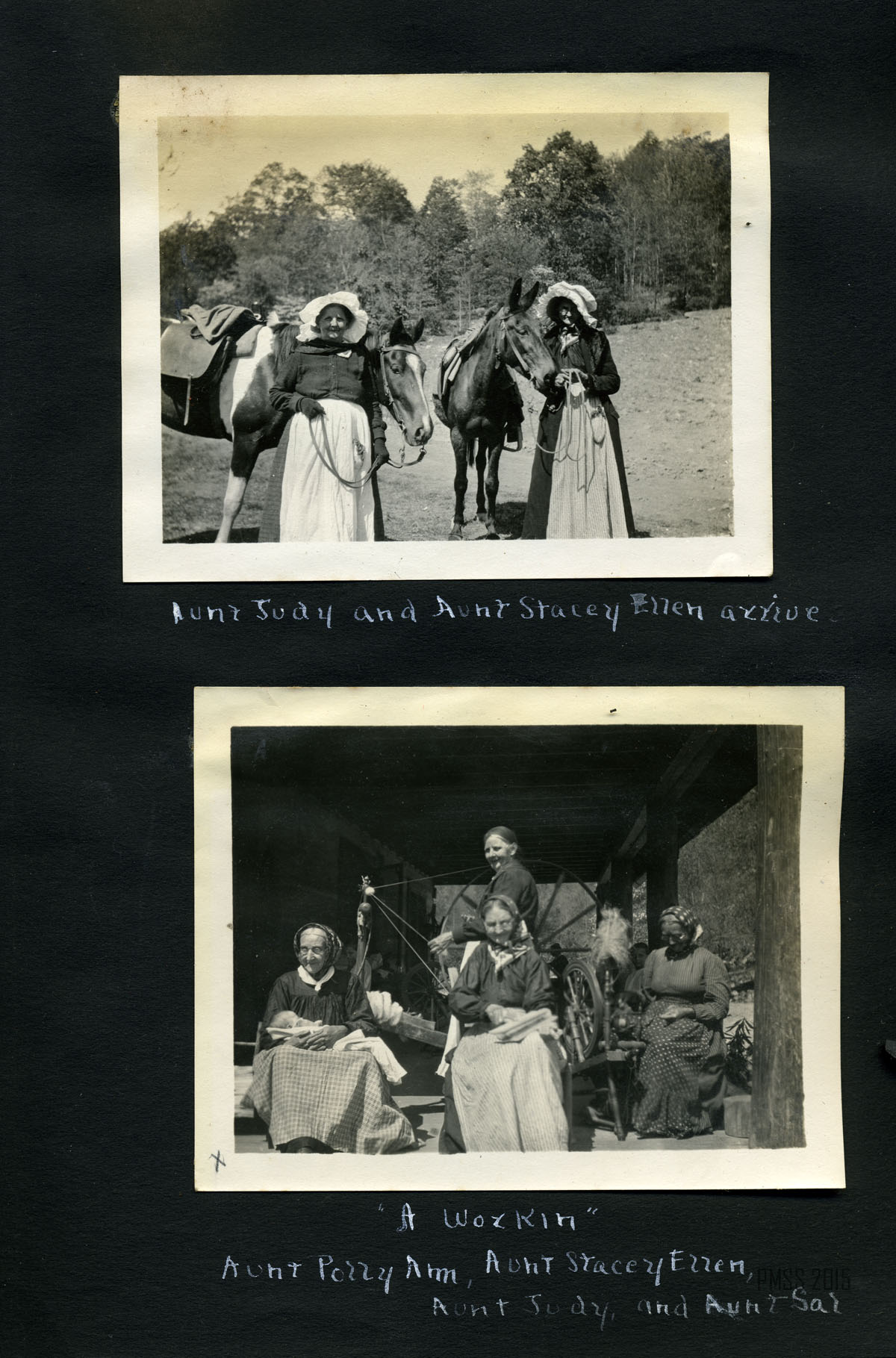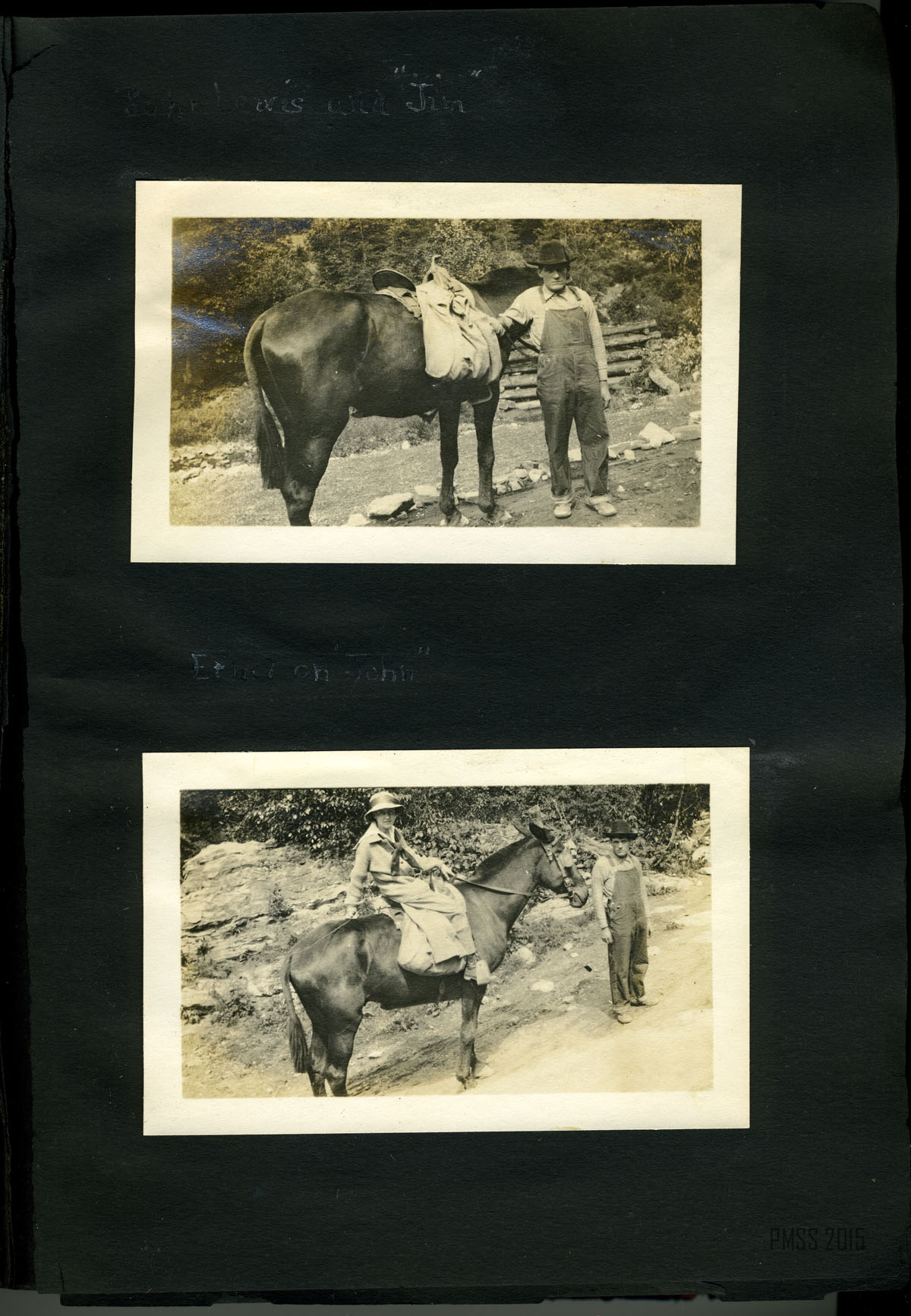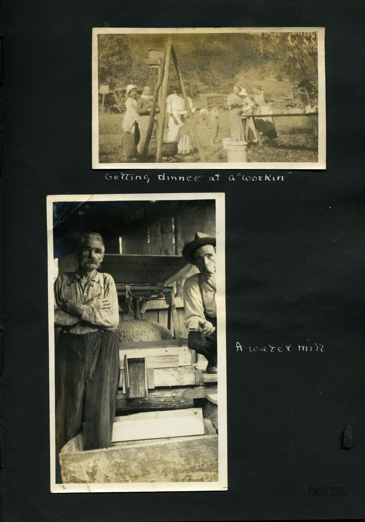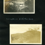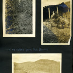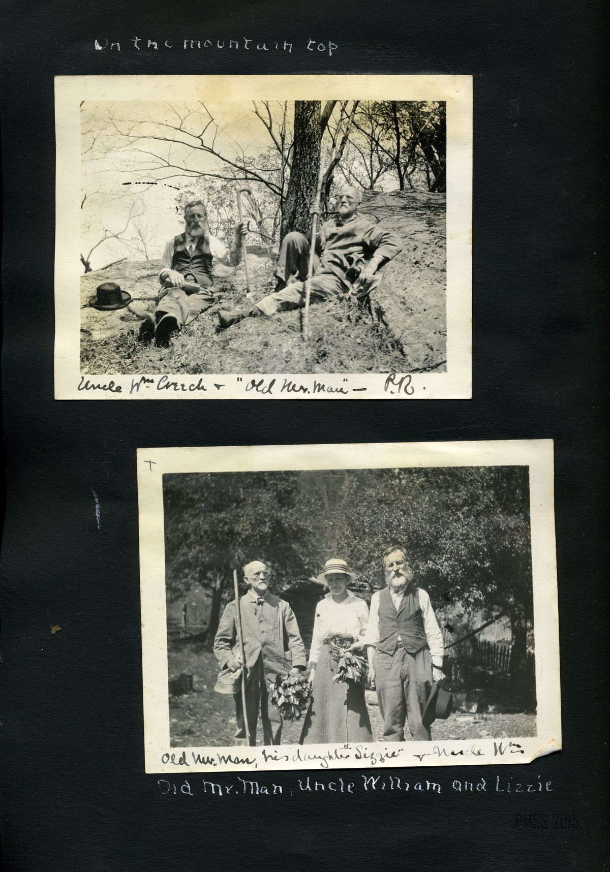 056a On the mountain top. Uncle Wm. Creech and “Old Mr. Man” – P.R. [Two older men: William Creech and Philip Roettinger sitting, Creech on left holding a cane, hat on the rock at left, Roettinger at right holding a walking stick.] ; 056b Old Mr. Man, Uncle William and Lizzie. [Philip Roettinger at left holding walking stick and plants, Elisabeth Roettinger in center holding plants, William Creech at right holding hat in hand.] ; 057a Getting dinner at a “workin.” [Three women at left by a “teepee” of three logs, three women at a table of food at right, two boys in background.] ; 057b A water mill. [Two men: older man standing at left with arms crossed, younger man squatting at right with food to his mouth.] ; 058a Mary Ann Begley. [Young woman standing in a clearing with forest in the background.] ; 058b Dot and Chester. [Man and woman on a mule.] ; 059a Dot and Chester, Carman, Miss Gaines, Olga, and Oscar. [Six men and women lined up on five horses and mules?; fence in background.] ; 059b Down Gabe’s Branch. [Four people: three riding on mules, one standing going down a forest trail.] ; 060a Uncle Lewis and Aunt Katie Creech, Poorfork. [Three women at left, an older man and woman, and two young girls; large building in back at right.] ; 060b Annie and the “lil” dog. [Young woman at left, dog jumping straight up at right, building in back.] ; 061a View from the porch at Uncle Lewis’. [Roof of building in lower left corner, mountains in the distance.] ; 061b “Big Black” from near Poorfork. [Bridge visible in foreground, buildings and mountains in background.]