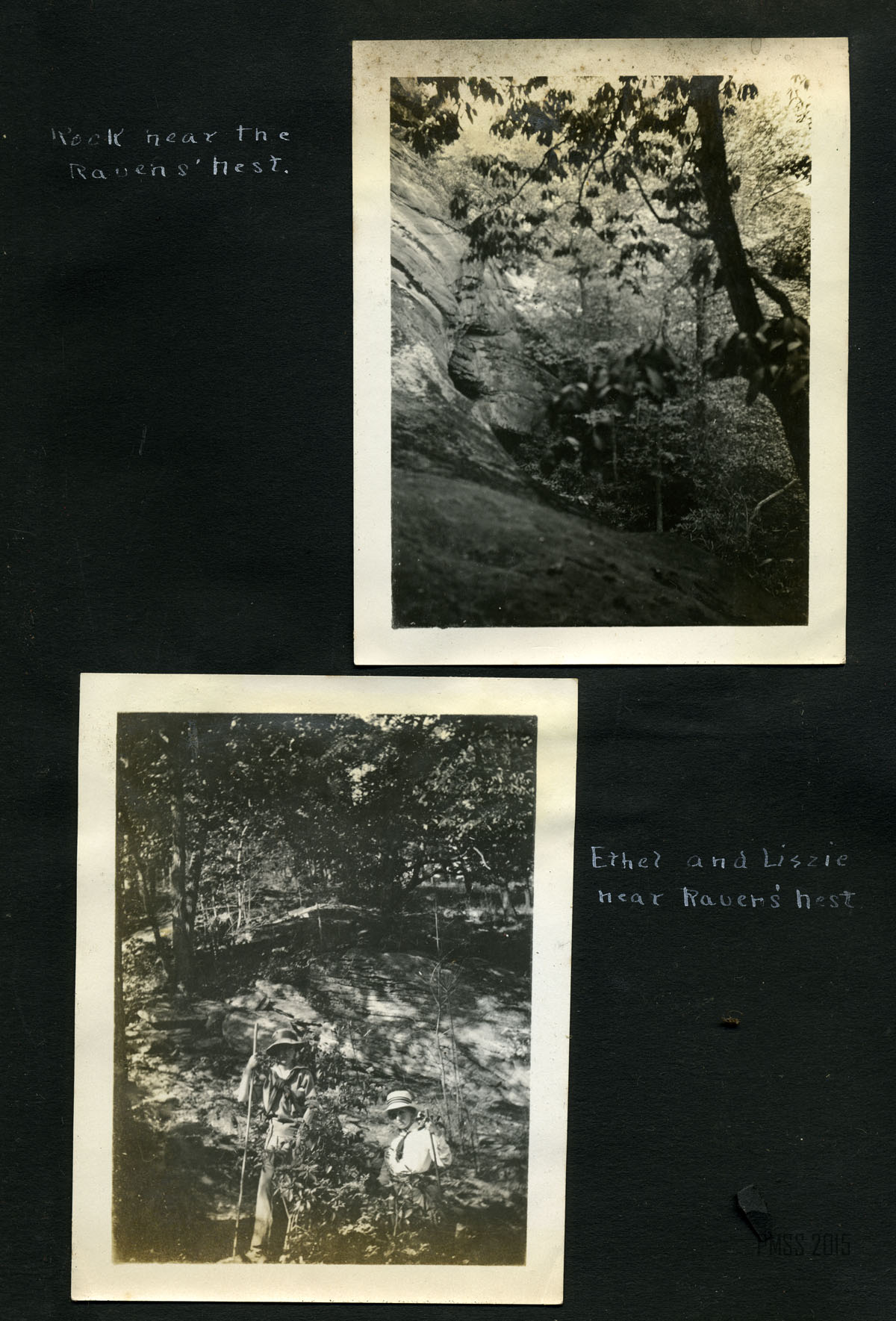 063b Ethel McCullough and Lizzie [Elizabeth Roettinger] near Raven’s Nest. [Two women standing with walking sticks in front, large rock and trees in background.] ; 064a [View from inside the Raven’s Nest?] ; 064b Looking out of the Raven’s Nest, a cave at the top of Pine Mountain near Poorfork. [Three people: two women, one man visible at bottom left; cave on right, view of the outside on left.] ; 065a [View from the Raven’s Nest, a cave at the top of Pine Mountain near Poorfork.] ; 065b [View from the Raven’s Nest, a cave at the top of Pine Mountain near Poorfork.] ; 066a Log Rock. [Three men and two women standing a top a large rock that looks like a fallen log.] ; 066b Great Rock at the top of Pine Mountain. [Three people visible just past tree line in forefront.] ; 067a Columbus and Lizzie on the road to Hurricane Gap. Elisabeth Roettinger, Columbus Creech. [Woman at left holding walking stick, man at right holding small parcel, walking down a trail.] ; 067b Ethel and Columbus, Poorfork and Black. Miss McCullough and Columbus. [Man and woman leaning against a wooden fence, dirt path in front, mountains in background.] ; 068a [Mountain view.]