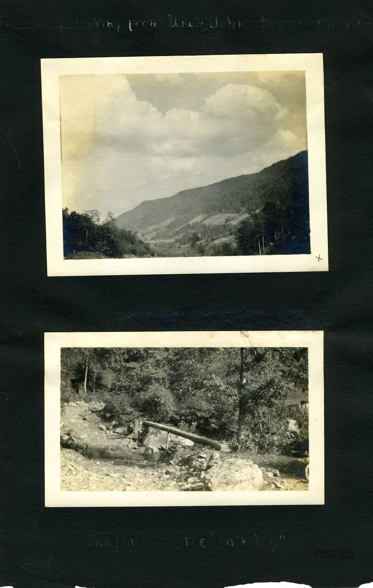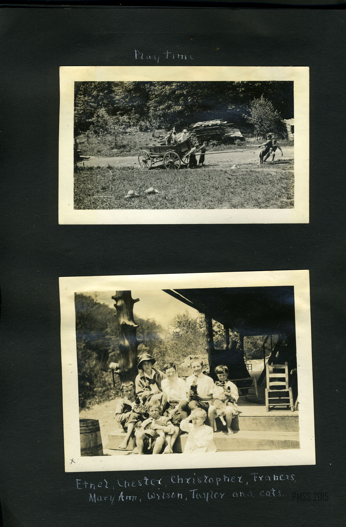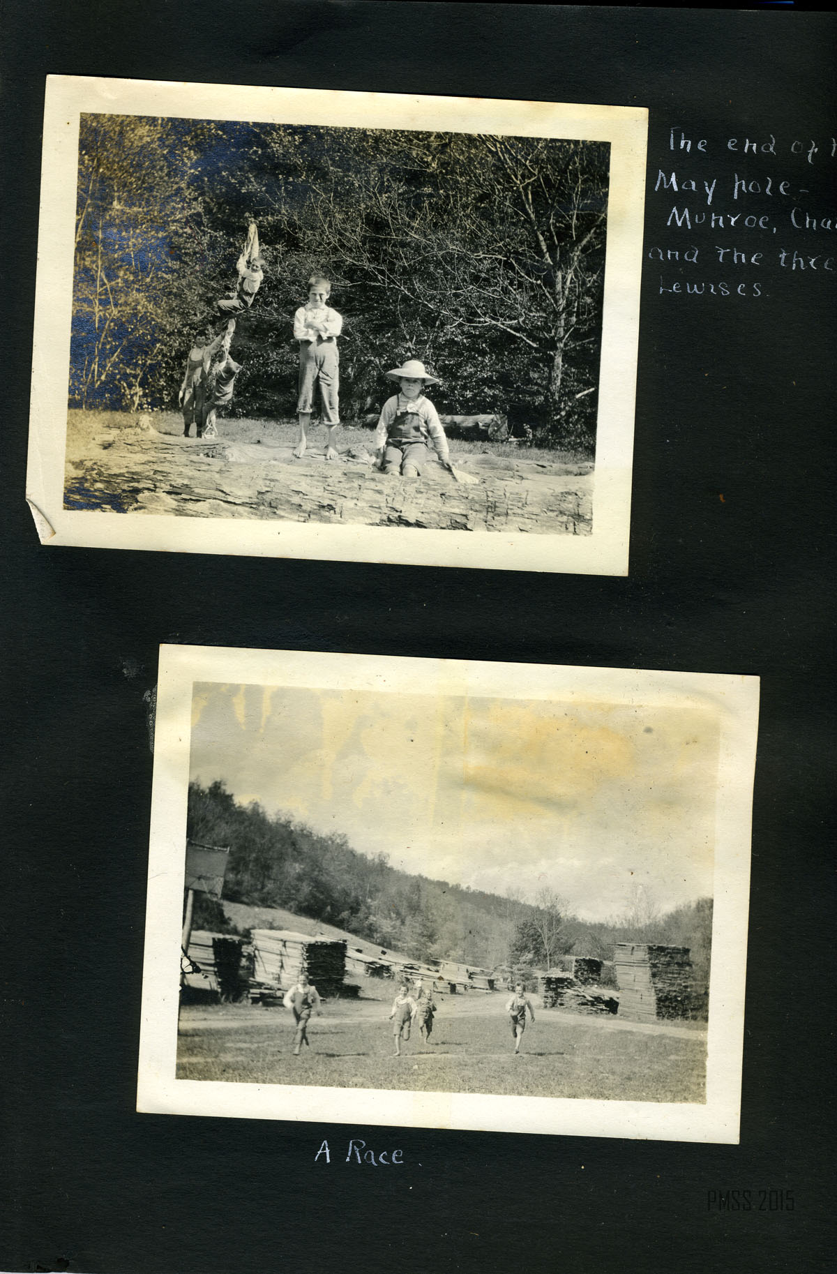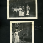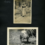 023b Trancie Turner. [Standing amongst shrubbery.] ; 023c Bertha and Mallie. [Standing against a building.] ; 024a Alifair, our cook.[Young woman outside wearing dark dress and hat.] ; 024b Trancie Turner. [Young woman outside, light colored dress and dark hat.] ; 025a Munroe and Mary Ann. [Young boy and girl at the bottom of a flight of outdoor steps, three people in background at top of steps.] ; 025b Dewie Lewis, John and Charlie. [Three young boys sitting outside.] ; 026a The baseball field. [People playing baseball, trees in background.] ; 026c On the rock by the toolhouse – work times past. [Four young boys sitting on a rock.] ;026b Becky May Huff. [Young girl holding books? tied up, mule in background.] ; 027a The end of the May pole – Munroe, Charlie and the three Lewises. [Five boys: Two in the foreground on large logs, one standing by a pole in the back, and two climbing on the pole.] ; 027b A Race. [Four young boys running, surrounded by several piles of wood.] ; 028a Play time. [Four young boys pulling three others on a wagon, large pile of wood in background.] ; 028b Ethel, Chester, Christopher, Francis, Mary Ann, Wilson, Taylor and cats. [Woman and six children sitting on steps of Old Log House.] ; 029a On the walk-log. [Woman and six children: Ethel, Chester, Christopher, Francis, Mary Ann, Wilson, Taylor? standing on log over the ford.] ; 029b [Ethel, Chester, Christopher, Francis, Mary Ann, Wilson, Taylor and cats? standing by the edge of Old Log House porch.] ; 030a Way down Greasy, Dot on “Goeble.” [Woman riding on mule, trees in background.] ; 030b Dot playing at Narcissus. [Woman bent down by edge of pool of water with hands in water.] ; 031a Olga and Dot. [Two women sitting: one of left cross-legged, one on right arms around knees.] 031b Dot and Lizzie at the pool. [Two women: one on left standing, one on right squatting.] ; 032a A far view. [Three thin trees in foreground, mountains in background.]