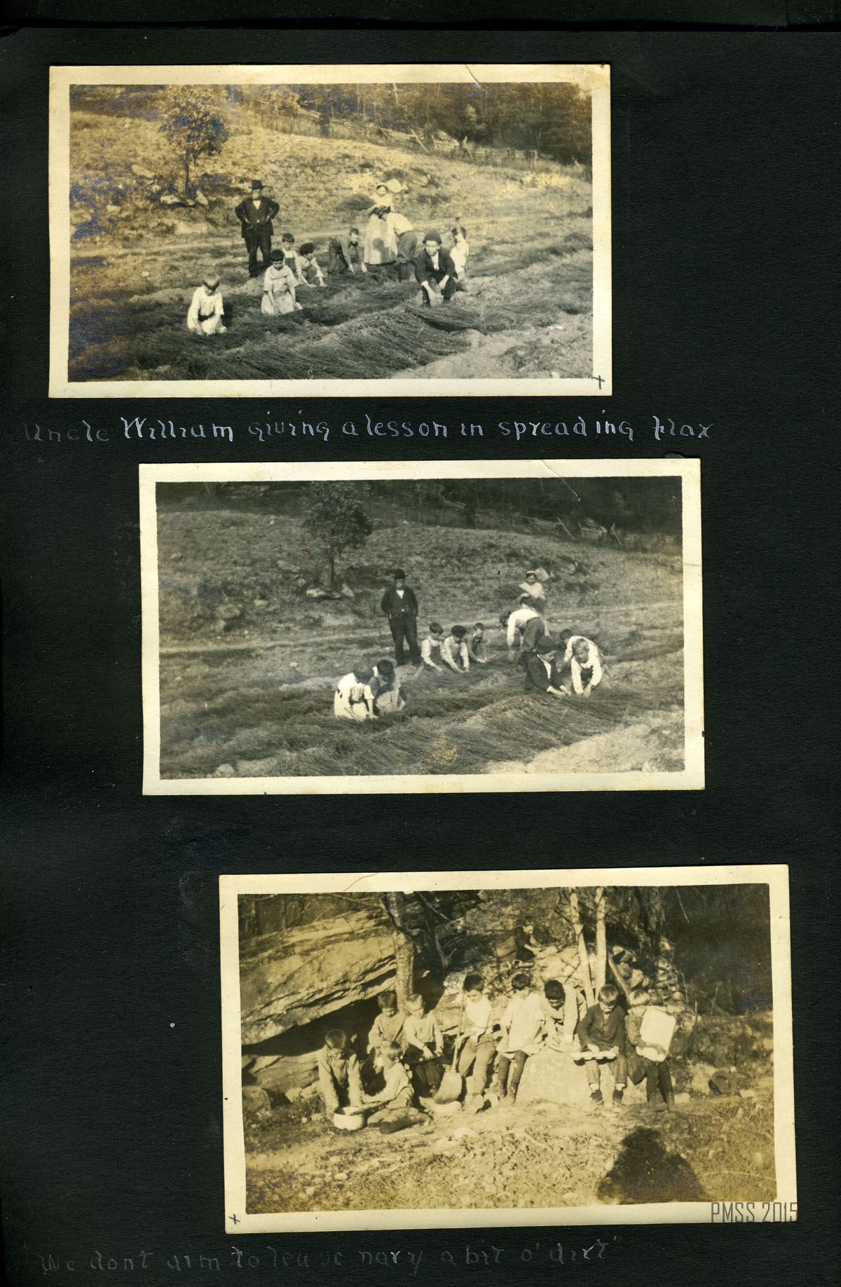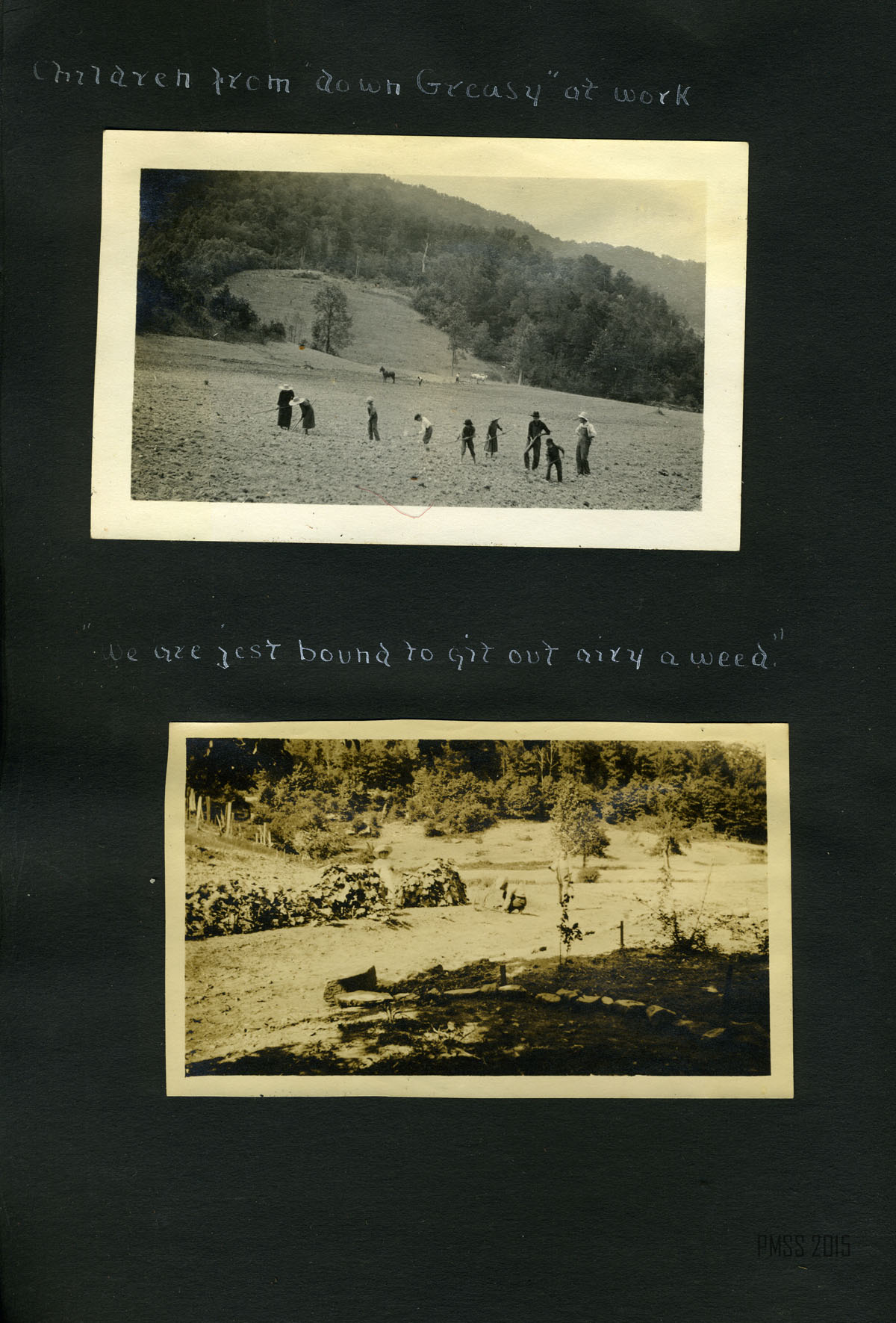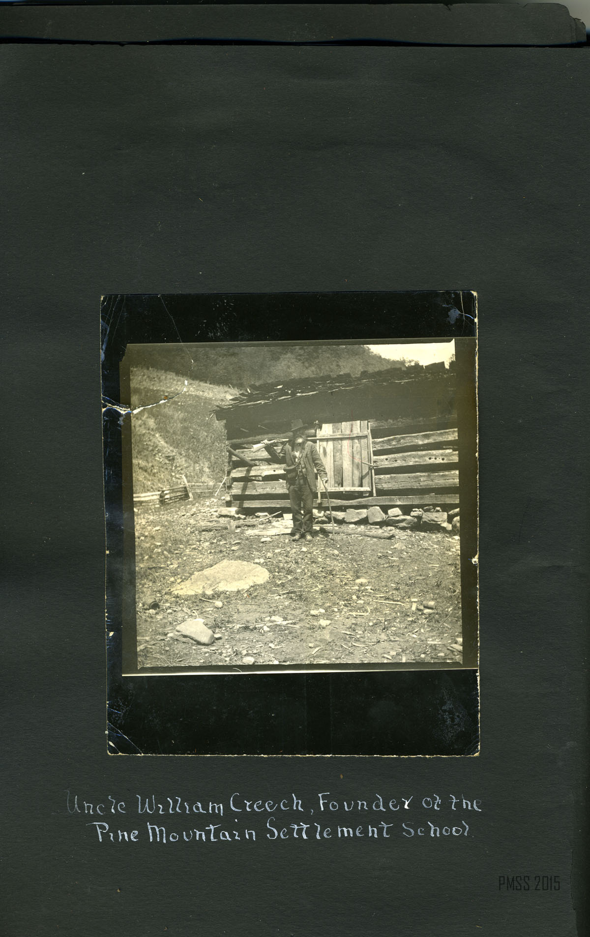 001 The children and their playmate. [15 children on stone steps with porch in background; Older man, Philip Roettinger?, in back row and young man in center.] ; 002a Dillon, April 29, 1915. Starting in. [Two men, woman and boy. Younger man attaching luggage to one of two mules. Older man is Philip Roettinger?] ; 002b Down the road. [Two men, one man riding on one of two mules, woman and boy walking down dirt road with backs to camera. Railroad tracks to right?] ; 003a [Big Log; from a distance.] ; 003b Big Log House [Close up from side with chimney.] 004a [Old Log House from across the campus, one figure in front of the building, two figures off to the right.] 004b Old Log House. [Up close.] 005a Old Log House from yon side the walk-log ; 005b Old Log House from Pine Knoll ; 006a The valley from Uncle John’s toward the school ; 006b The ford and the walk-log. [A wooden plank set across a small ford.] ; 007a A bit of mountain road. [Piles of leaves to the right, trees in the back.] ; 007b Our reception. [Building with wooden fence in front. Three young boys standing atop fence, 15 standing in front of fence: two women in back row on left, man in back row center, Philip Roettinger? middle row, the rest children.] ; 008a John Lewis and “Jim.” [John Lewis standing to the right of a mule, mule’s head behind Lewis’.] ; 008b Ethel on “John.” [Ethel sitting on a mule, John Lewis? standing in front of the mule.] ; 009a Part of the school farm. ; 009b The living room of the Big Log House. [Bookcases with an animal pelt hanging on the wall above.] ; 010a Pole House from meadow ; 10b Pole House. [Up close.] ; 011a View from the Pole House window ; 011b [View from Pole House window of mountain and trees.] ; 012a [Mountain road, dirt path surrounded by trees.] ; 012b Old Mr. Man on Pole House. [Philip Roettinger sitting on porch.] ; 012c View of valley from Pole House ; 013a The road above Joe Day‘s. [Dirt road on left, tree stump on right.] ; 013b [Dirt road on right winding through trees.] ; 014 Uncle William Creech, Founder of Pine Mountain Settlement School. [In front of his cabin?, standing with rifle over shoulder and walking stick.] ; 015a Uncle William and Aunt Sal digging “pie plant” [rhubrb] ; [William Creech, Aunt Sal, his wife, and two young boys in field.] ; 015b The Postmaster. [Standing on porch of post office?] ; 015c Uncle William and little William. [William Creech holding toddler boy, young girl and toddler girl standing to the right.] ; 016a Brit [Wilder], one of the grandchildren. [Wooden fence in background.] ; 016b Aunt Sal. [Sitting with butter churner? in a kitchen.] ;017a Aunt Sal and the little flax wheel, “money couldn’t buy her.” ; 017b Aunt Sal and Columbus[Creech]. In front of the Creech cabin?] ; 018a Uncle William giving a lesson in spreading flax. [William Creech, standing in back, and 9 children in the field.] ; 018b Uncle William giving a lesson in spreading flax. [William Creech, standing, and nine children.] ; 018c “We don’t aim to leave nary a bit o’ dirt.” [Big rock in background, nine young boys sitting in a row, fifth from left with a broom.] ; 019a Charlie, the boy who smiles. [Young boy standing with wooden gates in background.] ; 019b Planting cow-peas in new ground. [One man and seven children planting on a hillside.] ; 020a Children from “down Greasy” at work. [One man and eight children in a working in a field, mountain in background.] ; 020b “We are jest bound to git out airy a weed.” [Three children working, dirt patch in foreground, trees in background.] ; 021a Chester, Barton, Christopher, and Wilson. [Planting blossoms.] ; 021b Planting Blossoms. [Christopher, Woman, Wilson, Chester, Barton?. Fence in background.] ; 022a John and his chest. [Young boy standing on stone stairs, hat on steps next to him, chest on right.] ; 022b Christopher (Fleet Foot). [Young boy standing in dirt in foreground, mountain in background.] ; 022c The best-beloved “Miss de Long, and her children, John, Christlie, Wilson, Charlie, Chester, Dosia, Barton. [Picture Missing]