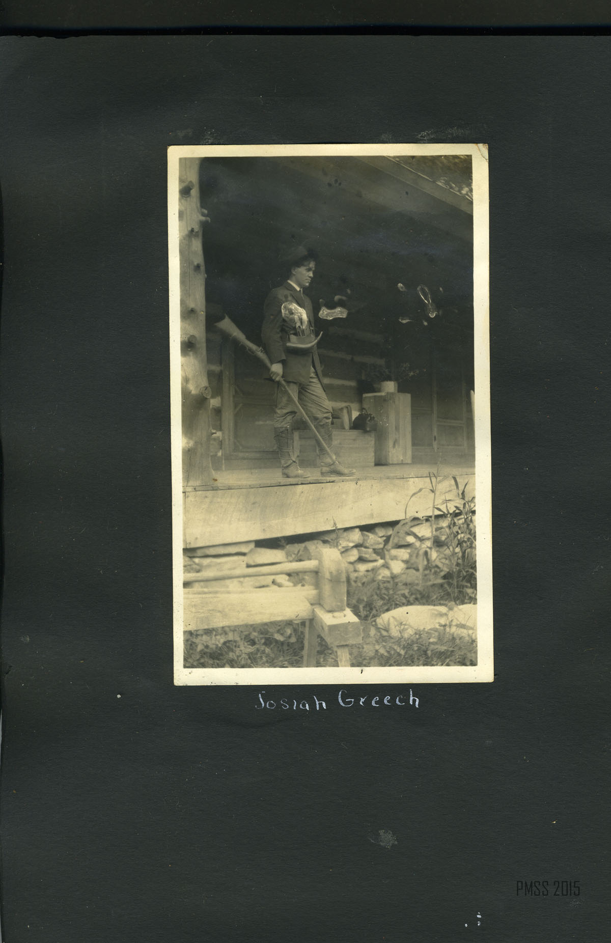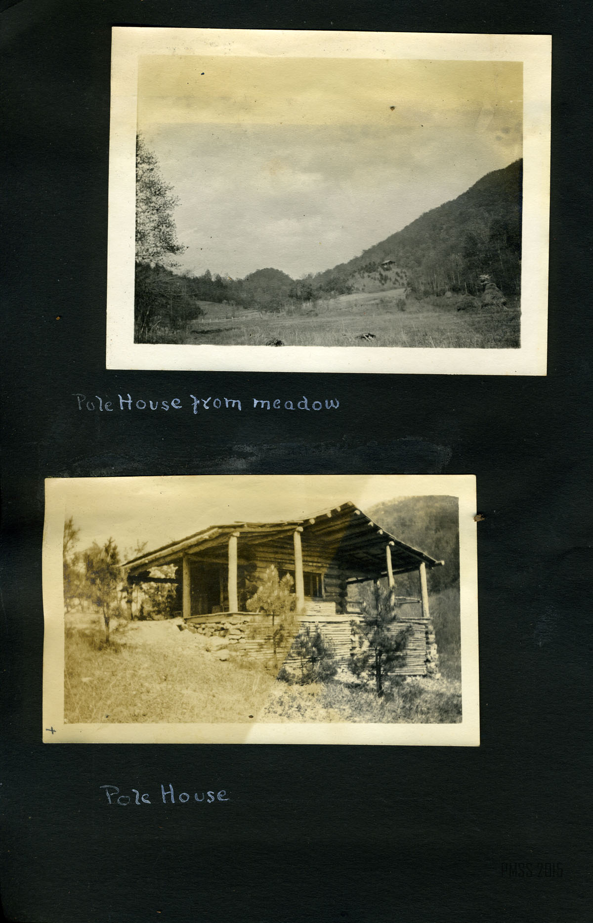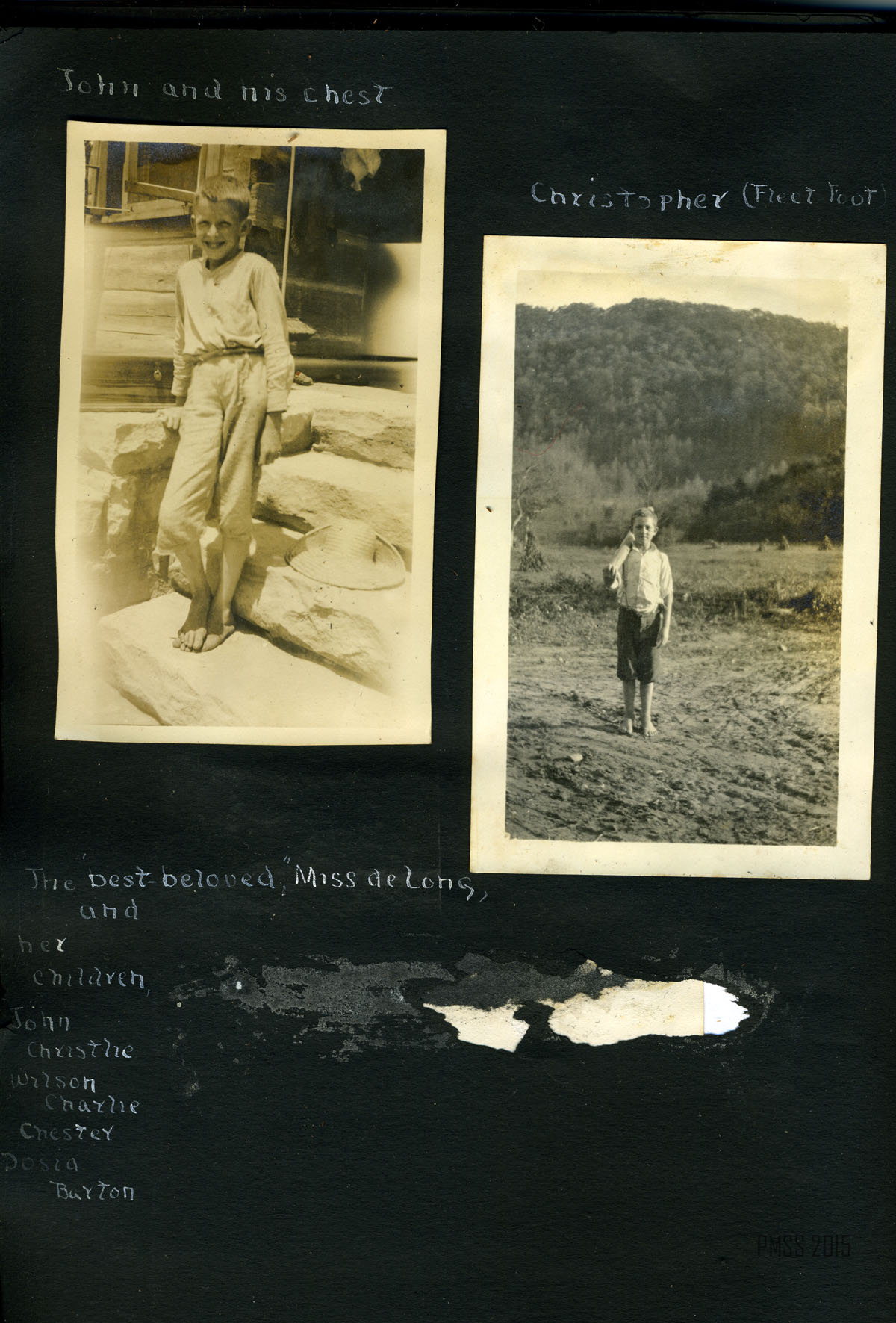 001 The children and their playmate. [15 children on stone steps with porch in background; Older man, Philip Roettinger?, in back row and young man in center.] ; 002a Dillon, April 29, 1915. Starting in. [Two men, woman and boy. Younger man attaching luggage to one of two mules. Older man is Philip Roettinger?] ; 002b Down the road. [Two men, one man riding on one of two mules, woman and boy walking down dirt road with backs to camera. Railroad tracks to right?] ; 003a [Big Log; from a distance.] ; 003b Big Log House [Close up from side with chimney.] 004a [Old Log House from across the campus, one figure in front of the building, two figures off to the right.] 004b Old Log House. [Up close.] 005a Old Log House from yon side the walk-log ; 005b Old Log House from Pine Knoll ; 006a The valley from Uncle John’s toward the school ; 006b The ford and the walk-log. [A wooden plank set across a small ford.] ; 007a A bit of mountain road. [Piles of leaves to the right, trees in the back.] ; 007b Our reception. [Building with wooden fence in front. Three young boys standing atop fence, 15 standing in front of fence: two women in back row on left, man in back row center, Philip Roettinger? middle row, the rest children.] ; 008a John Lewis and “Jim.” [John Lewis standing to the right of a mule, mule’s head behind Lewis’.] ; 008b Ethel on “John.” [Ethel sitting on a mule, John Lewis? standing in front of the mule.] ; 009a Part of the school farm. ; 009b The living room of the Big Log House. [Bookcases with an animal pelt hanging on the wall above.] ; 010a Pole House from meadow ; 10b Pole House. [Up close.] ; 011a View from the Pole House window ; 011b [View from Pole House window of mountain and trees.] ; 012a [Mountain road, dirt path surrounded by trees.] ; 012b Old Mr. Man on Pole House. [Philip Roettinger sitting on porch.] ; 012c View of valley from Pole House ; 013a The road above Joe Day‘s. [Dirt road on left, tree stump on right.] ; 013b [Dirt road on right winding through trees.] ; 014 Uncle William Creech, Founder of Pine Mountain Settlement School. [In front of his cabin?, standing with rifle over shoulder and walking stick.] ; 015a Uncle William and Aunt Sal digging “pie plant” [rhubrb] ; [William Creech, Aunt Sal, his wife, and two young boys in field.] ; 015b The Postmaster. [Standing on porch of post office?] ; 015c Uncle William and little William. [William Creech holding toddler boy, young girl and toddler girl standing to the right.] ; 016a Brit [Wilder], one of the grandchildren. [Wooden fence in background.] ; 016b Aunt Sal. [Sitting with butter churner? in a kitchen.] ;017a Aunt Sal and the little flax wheel, “money couldn’t buy her.” ; 017b Aunt Sal and Columbus[Creech]. In front of the Creech cabin?] ; 018a Uncle William giving a lesson in spreading flax. [William Creech, standing in back, and 9 children in the field.] ; 018b Uncle William giving a lesson in spreading flax. [William Creech, standing, and nine children.] ; 018c “We don’t aim to leave nary a bit o’ dirt.” [Big rock in background, nine young boys sitting in a row, fifth from left with a broom.] ; 019a Charlie, the boy who smiles. [Young boy standing with wooden gates in background.] ; 019b Planting cow-peas in new ground. [One man and seven children planting on a hillside.] ; 020a Children from “down Greasy” at work. [One man and eight children in a working in a field, mountain in background.] ; 020b “We are jest bound to git out airy a weed.” [Three children working, dirt patch in foreground, trees in background.] ; 021a Chester, Barton, Christopher, and Wilson. [Planting blossoms.] ; 021b Planting Blossoms. [Christopher, Woman, Wilson, Chester, Barton?. Fence in background.] ; 022a John and his chest. [Young boy standing on stone stairs, hat on steps next to him, chest on right.] ; 022b Christopher (Fleet Foot). [Young boy standing in dirt in foreground, mountain in background.] ; 022c The best-beloved “Miss de Long, and her children, John, Christlie, Wilson, Charlie, Chester, Dosia, Barton. [Picture Missing]
