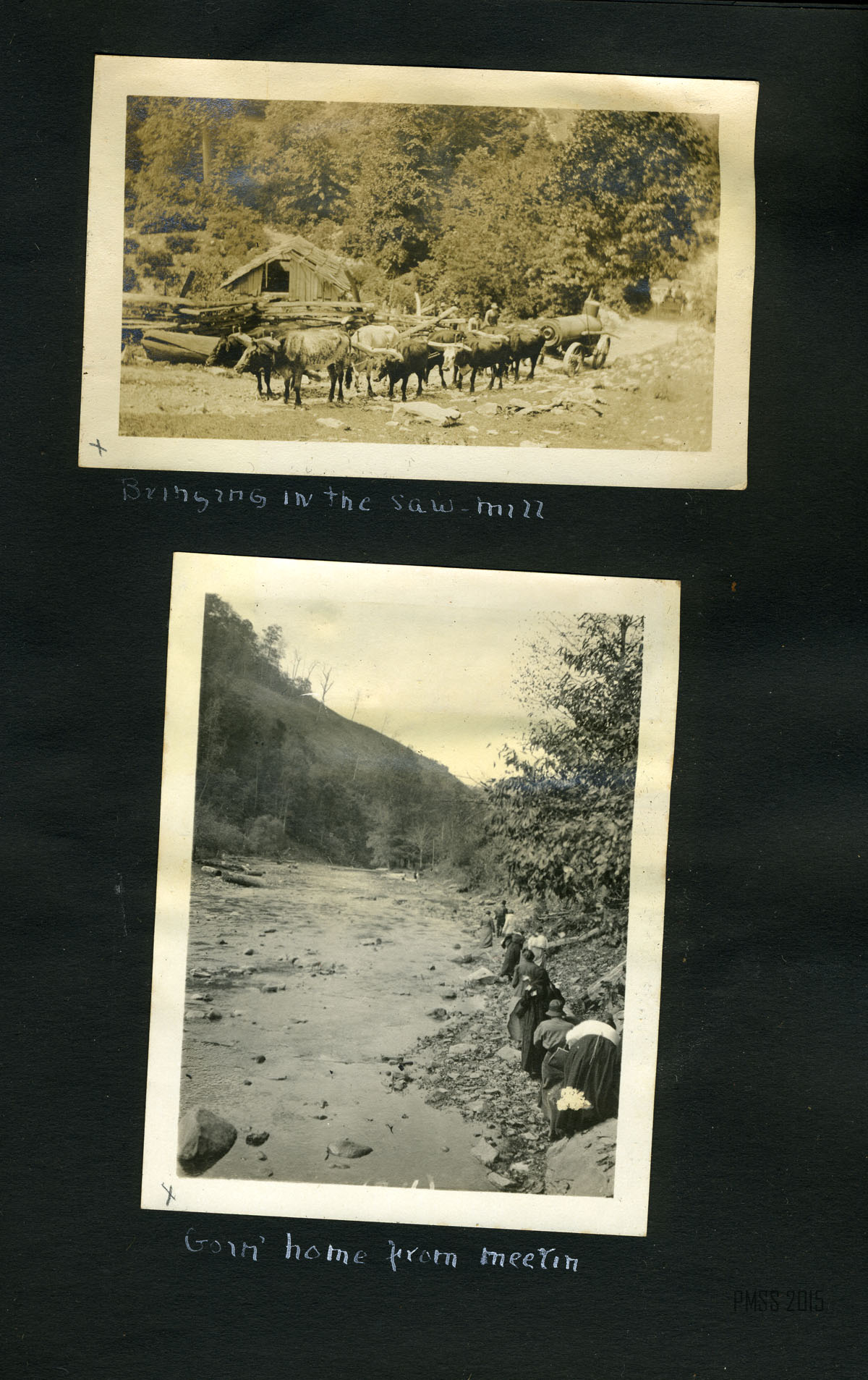 032b Taylor on Nell going to meetin’. [Young boy riding, creek? at far right.] ; 033a Bringing in the saw-mill. [Four pairs of animals yoked, dragging saw-mill, two people to left of saw-mill, building behind wooden fence on left.] ; 033b Goin’ home from meetin’. [Nine women and men walking in a line on the right, backs shown.] ; 034a [Mountain view: rocks and trees.]