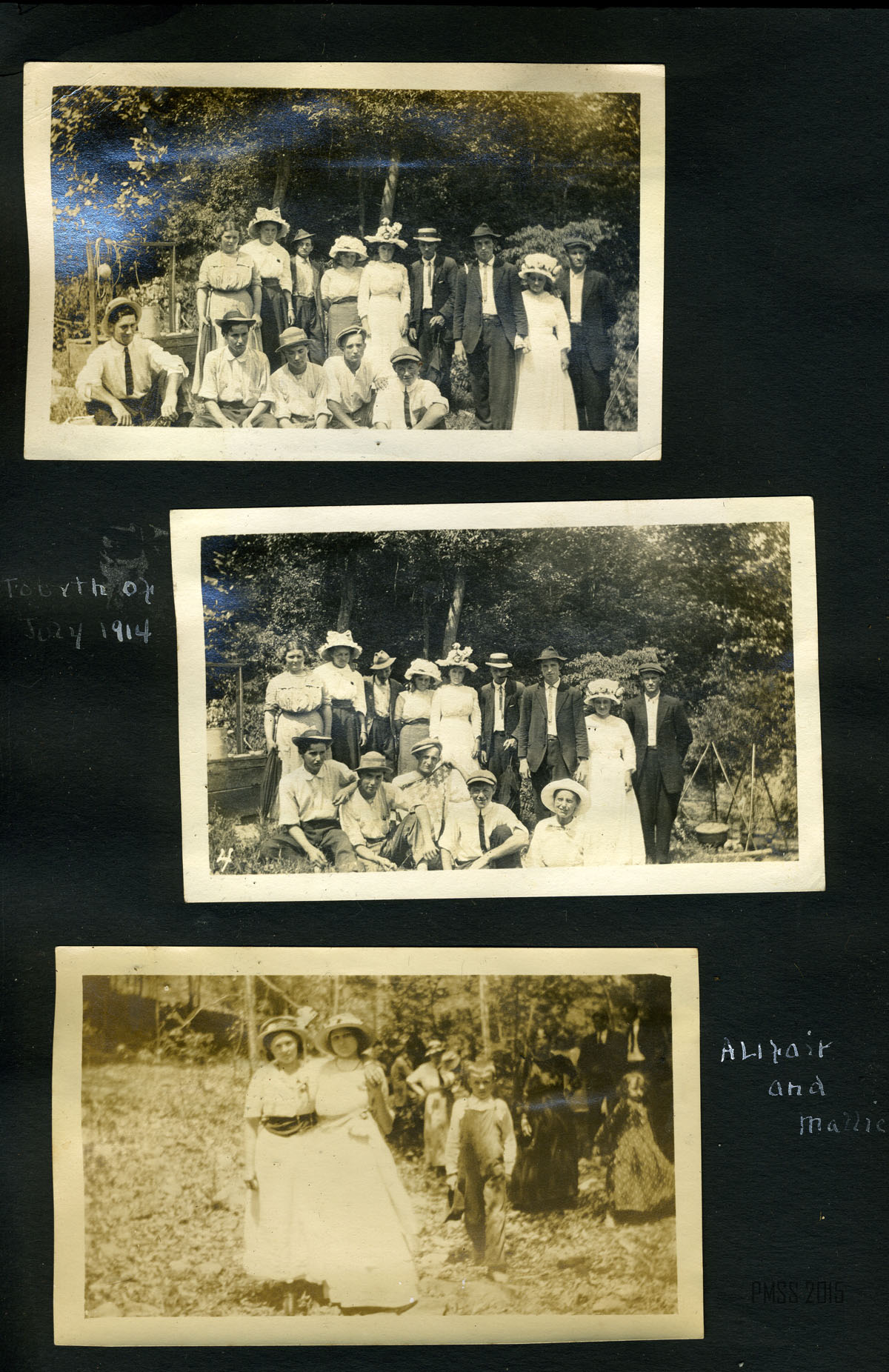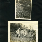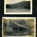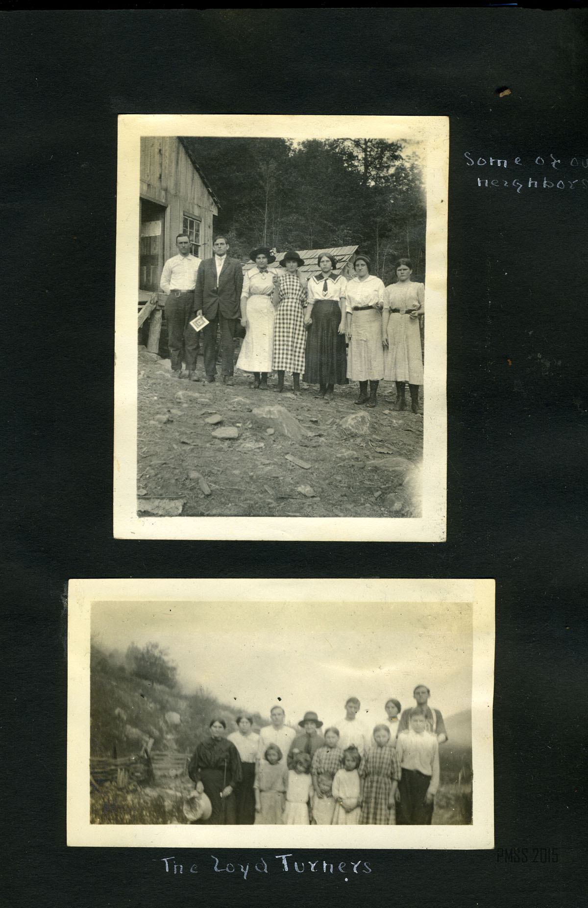 034b Greasy. [Creek surrounded by mountain on all sides. ; 035a A school house way down Greasy Creek. [Two mules? and several logs in foreground, school back right.] ; 035b A mansion. [Side of a wooden building at right, wooden chair at front right, back of a woman in background on left.] ; 036a [14 men and women outside: Nine standing in back, five men squatting in front, Fourth of July 1914.] ; 036b Fourth of July 1914. [14 men and women outside: Nine standing in back, four men and one woman squatting in front, person in middle front holding American flag?] ; 036c Alifair and Mallie. [Two women outside, one has arm around other’s shoulder, young boy to the right, various people in background on right.] ; 037a Some of our neighbors. [Two men and five women standing in a line outside, buildings behind in the center and at left.]