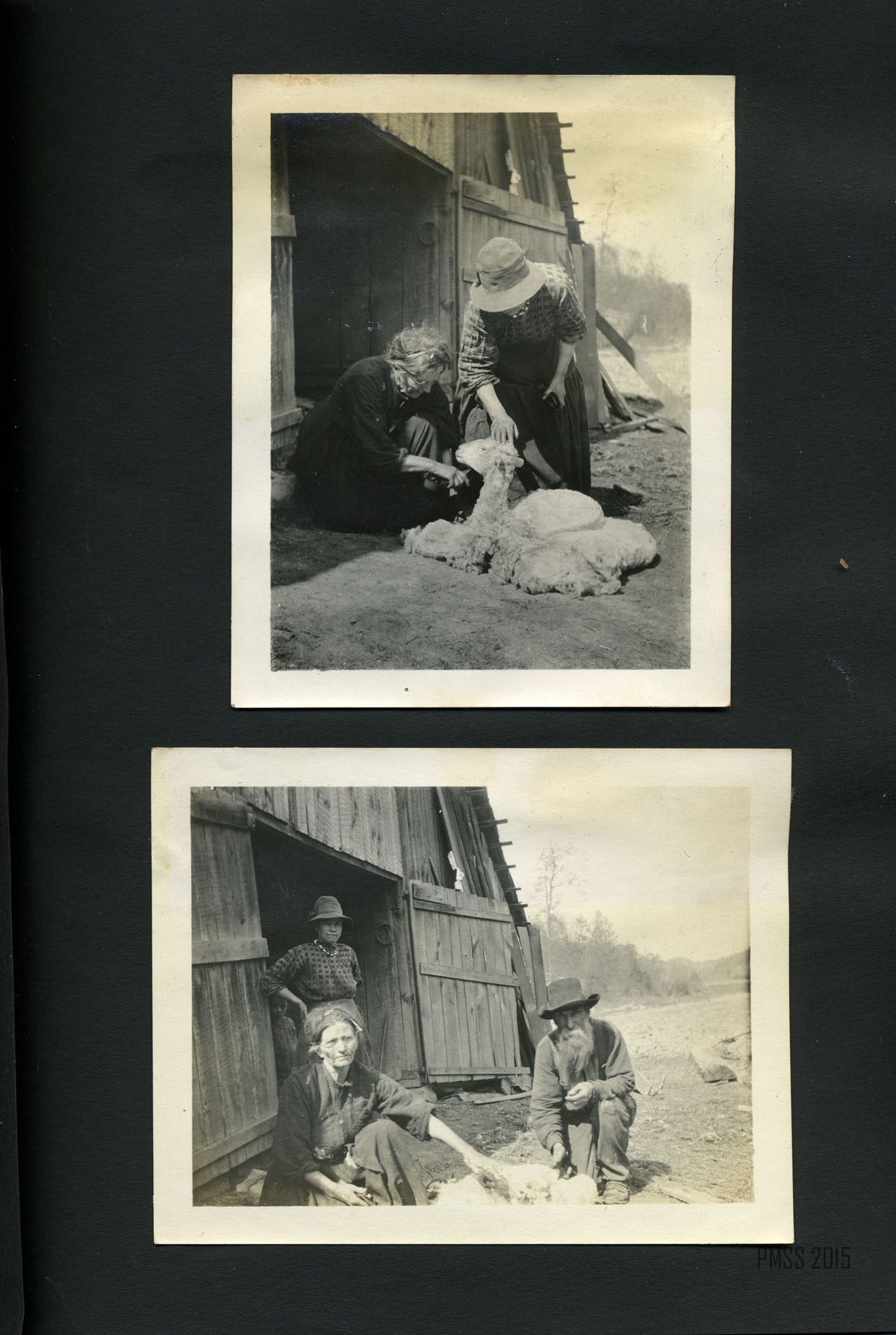 043b Sport! [Young man in overalls holding an animal in one hand.] ; 044a Alifair, Oscar, and Mallie. [Woman, man and woman standing in a line in front of a mule.] ;044b Mallie and the Turner baby. ; 045a Mary Ann, Mallie, and Miss Watts. [Three women: one standing in doorway of building, one leaning against building, and one standing in front of a fence; small child at foot of door.] ; 045b Frances. [Small child carrying plants standing on a foot-log?] ; 045c Goin’ to meetin. [Three people: Philip Roettinger on a mule, woman and small boy on another mule, mules standing in water.] ; 046 Sheep Shearing, Uncle John, Aunt Sis, and Mrs. Joe Day. [Woman standing next to a barn on left, watching man and woman sheer a sheep.] ; 047a [Aunt Sis and Mrs. Joe Day sheering a sheep, barn at left.] ; 047b [Uncle John, Aunt Sis, and Mrs. Joe Day with a sheep. Woman standing next to barn at left, woman and man kneeling next to sheep.] ; 048a Meetin’ in the grove. [Two women: one at left and one at right sitting amidst trees, several others sitting in background.] ;048b Two of the Turners. [Two men standing in front of the post office? to the left of the porch. Tobacco sign on side of building.] ; 049a Aunt Judy at home. [Woman sitting at left, churner at right, fireplace at back right.] ; 049b Aunt Judy Turner and the “pied nag.” [Woman standing in front of a horse, fence in background.] ; 050a Bringing flax and the breaker. [Two boys: one at left carrying flax over his shoulder, one at right carrying the breaker? over his shoulder.] ; 050b Swinging flax, Aunt Sal and Lizzie. [Older woman at left swinging flax, Elisabeth Roettinger? at right watching.] ; 051a Aunt Judy and Aunt Stacey Ellen arrive. [Two women: One at left standing next to a horse?, one at right standing next to a mule.]