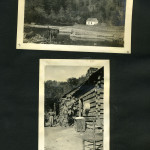 091a Carpenter Shack. [Large building, part of cut log in foreground.] ; 091b [Four men on dirt path: two standing, two on mules?, second from left is Philip Roettinger?] ; 092a Gordon Morigan at Line Fork. [Man on mule in front of building at right, fencing and trees on left.]