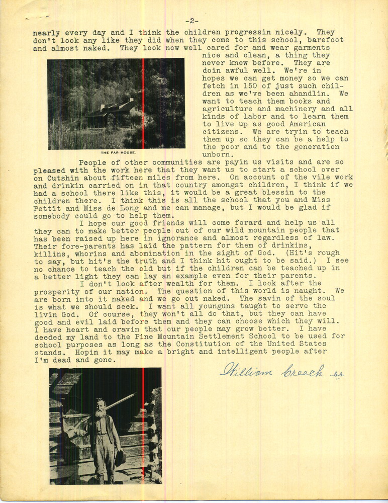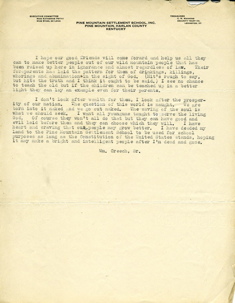 Creech visits the school nearly every day and sees much progress in the care of the children. He and the others hope for money to have 150 children at the school. He describes what they would learn. Cutshin people also want a school. Creech hopes friends will help the younger generation of mountain people have a better life. He has deeded his land to the school for that purpose. Signed by William Creech, Sr.