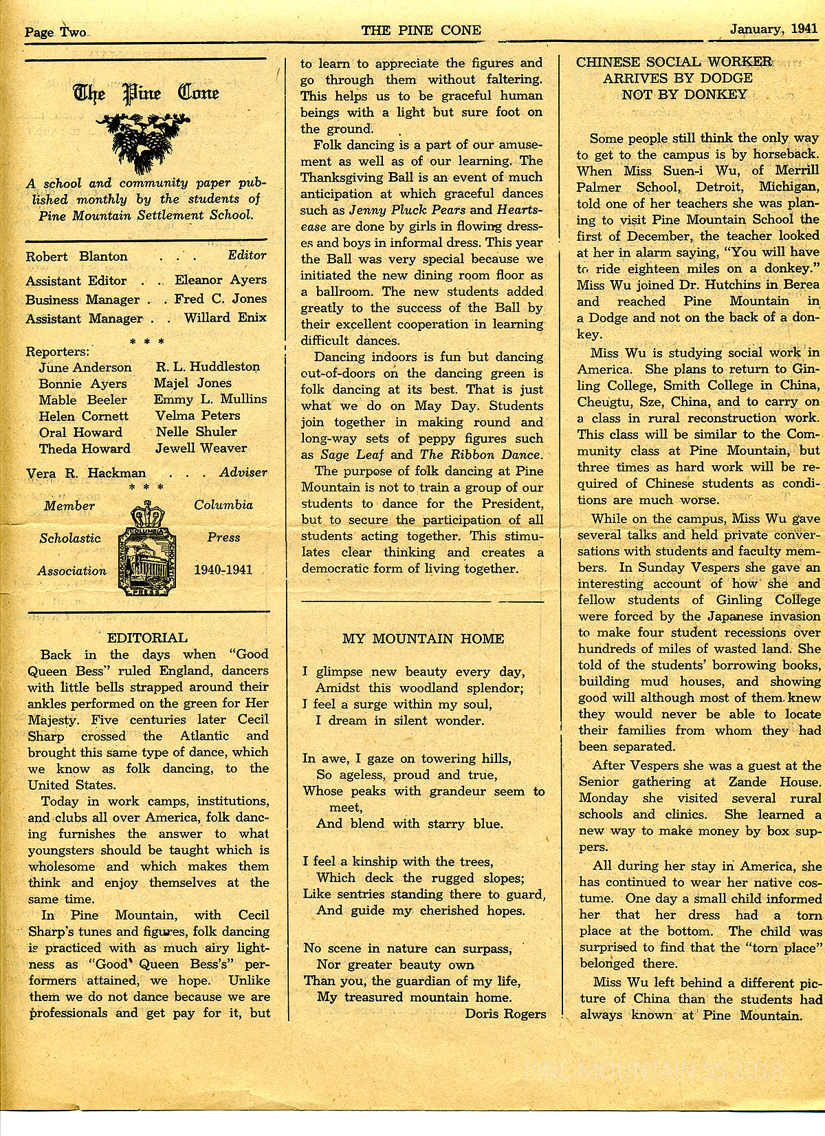 Editorial: ‘Good Queen Bess’ and folk dancing at Pine Mountain; “My Mountain Home” poem by Doris Rogers; Chinese Social Worker Arrives by Dodge not by Donkey; Community Group news.