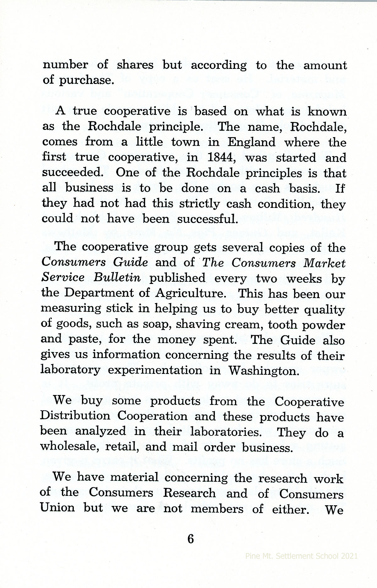 Schulman’s article describes the Co-op at Pine Mountain Settlement School in operation since 1937, as an exemplary model. He describes the mountain co-op store on campus as largely centered on an inventory of groceries and school supplies and modeled on the Rochdale principles as a base for the sophomore curriculum at the School. He outlines the Rochdale principles