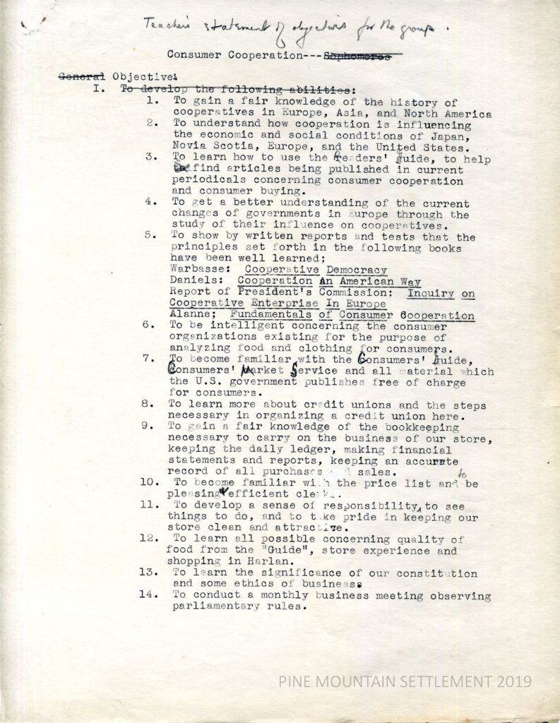 In a class hand-out, the Consumer Cooperative class objectives were described in the following manner by the teacher (not identified), The instructor’s edits to the class hand-out may be seen in the copy.