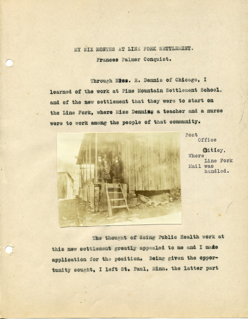 Frances Palmer (Conquist) came to Pine Mountain’s Line Fork Settlement only for a short six months in 1920. She was one of the first workers to come to the satellite extension at Line Fork Medical Settlement and her narrative is particularly important as it is a very candid response to the medical needs of the community in Letcher County and Harlan County by the first nurse to work at the Line Fork Settlement.