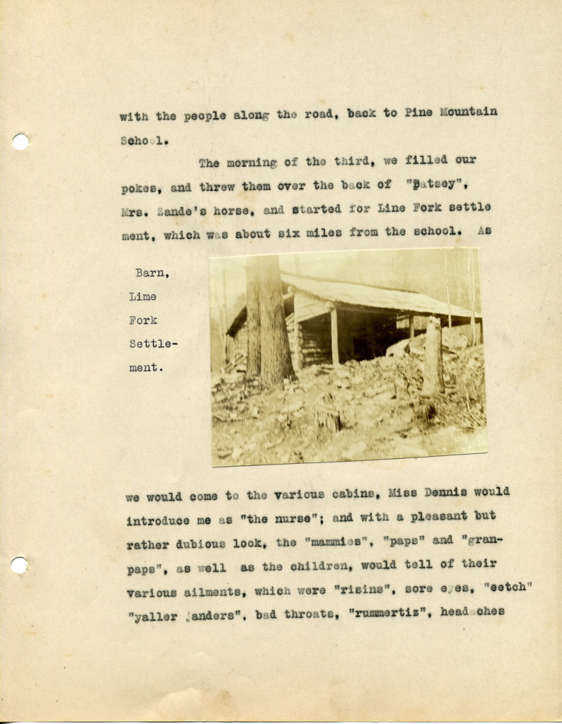 The morning of the third, we filled our pokes, and threw them over the back of “Betsey”, Mrs. Zande’s horse, and started for Line Fork settlement, which was about six miles from the school. As we would come to the various cabins, Miss Dennis would introduce me as “the nurse”; and with a pleasant but rather dubious look, the “mammies”, and “paps” and “granpaps”, as well as the children, would tell of their various ailments, which were “prisons”, sore eyes, “eetch”, “yaller janders” [jaundice], bad throats, “rummertiz”, headaches [page 04] and “such like”.