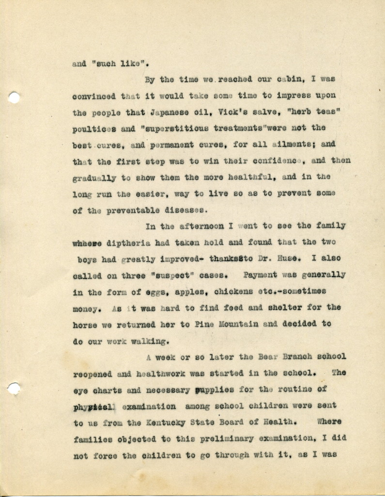 A week or so later the Bear Branch school reopened and health work was started in the school. The eye charts and necessary supplies for the routine of physical examination among school children were sent to us from the Kentucky State Board of Health. Where families objected to this preliminary examination, I did not force the children to go through with it, as I was [page 05] not sure what the outcome would be.
