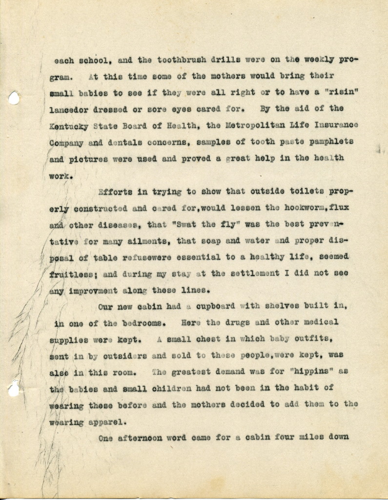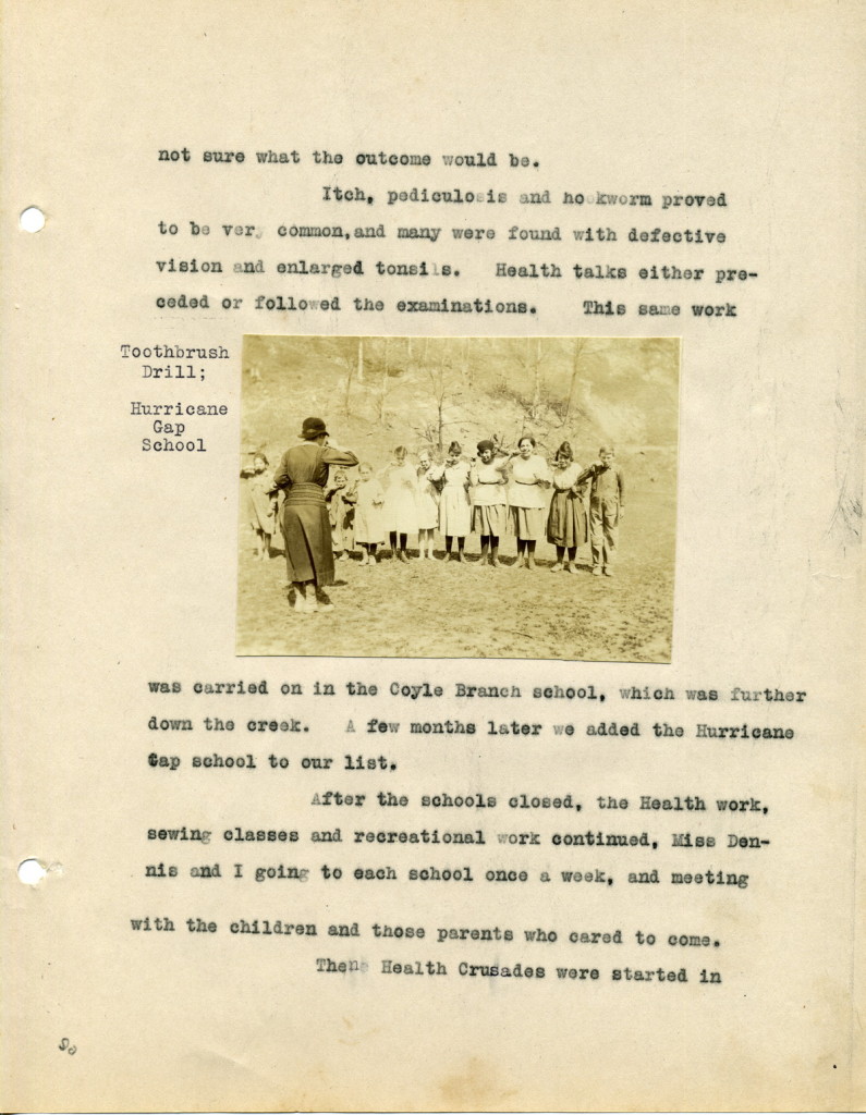 The Health Crusades were started in [page 06] each school, and the toothbrush drills were on the weekly program. At this time some of the mothers would bring their small babies to see if they were all right or to have a “risin” lanced or dressed or sore eyes cared for. By the aid of the Kentucky State Board of Health, the Metropolitan Life Insurance Company and dental concerns, samples of tooth paste pamphlets and pictures were used and proved a great help in the health work.