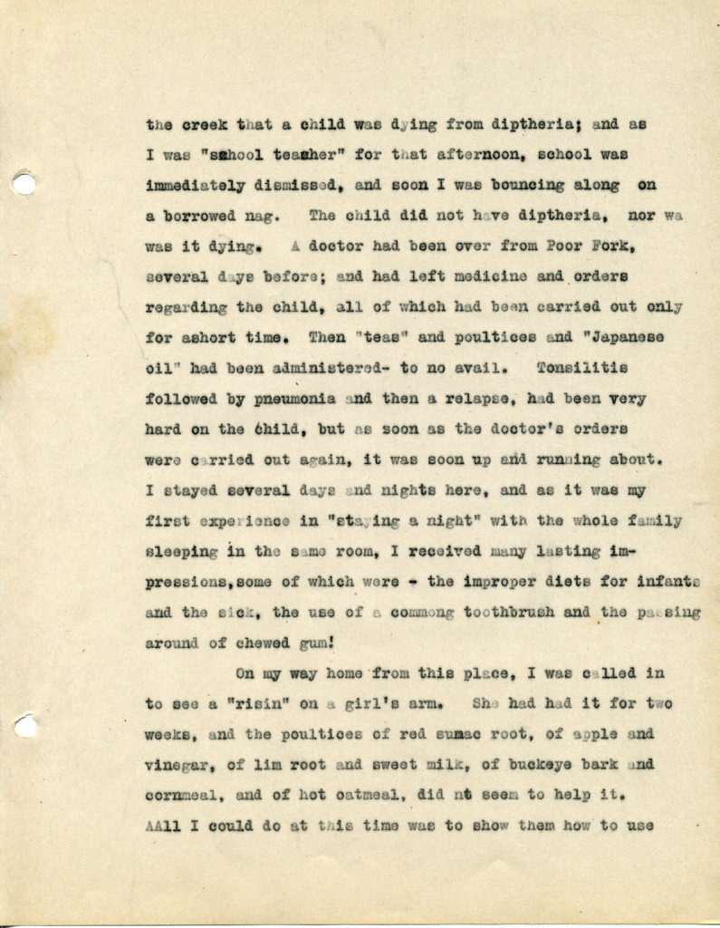 One afternoon word came from a cabin four miles down [page 07] the creek that a child was dying from Diptheria; and as I was “school teacher” for that afternoon, school was immediately dismissed, and soon I was bouncing along on a borrowed nag. The child did not have diphtheria and it was not dying. A doctor had been over from Poor Fork several days before; and had left medicine and orders regarding the child, all of which had been carried out for a short time. Then “teas” and poultices and “japan oil” had been administered to no avail. Tonsillitis had been followed by pneumonia and then a relapse and had been very hard on the child, but as soon as the doctor’s orders were carried out again, it was soon up and running about. I stayed several days and nights here, and as it was my first experience in “staying a night” with the whole family sleeping in the same room, I received many lasting impression, some of which were — the improper diets for children and the sick, the use of a common toothbrush and the passing around of chewed gum!