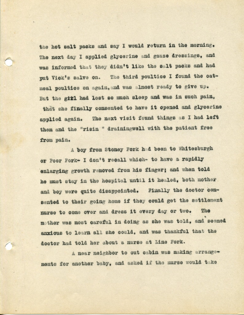 A boy from Stoney Fork had been to Whitesburgh [sic] or Poor Fork — I don’t recall which — to have a rapidly enlarging growth reoved fron his finger; and when told he must stay in the hospital until it healed, both his mother and boy were quite disappointed. Finally the doctor consented to their going hoe if they could get the settlement nurse to come over and dress it ever day or two. The mother was most careful in doing as she was told, and seemed anxious to learn all she could, and wa thankful that the doctor had told her about a nurse at Line Fork.
