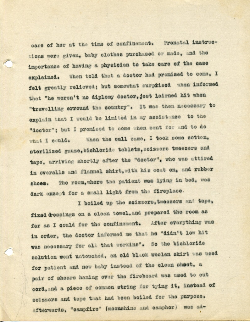 I boiled up the scizzors [sic], tweezers and tape, fixed dressings on a clean towel, and prepared the room as far as I could for the confinement. After everything was in order, the doctor informed me that he “didn’t low hit wuz necessary for all that workins.” So the bichloride solution went untouched, an old black woolen skirt was used for patient and new baby instead of the clean sheet, a pair of shears hanging over the fireboard was used to cut [the] cord, and a piece of common string for tying it, instead of sizzors and tape that had been boiled for the purpose. Afterward, “campfire” (moonshine and camphor) was ad- [page 10] ministered to the mother, and a burnt rag dressing applied to the baby’s cord. When it was all over. the “doctor” said “Well miss, I ‘lows me an’ you could work erlong might well together, and you jist go ahead and take keer uv them the rest er the time.” I hardly knew how to take this remark, but I took care of mother and baby from then on, though “Jim” and I had no more confinement cases together after that!