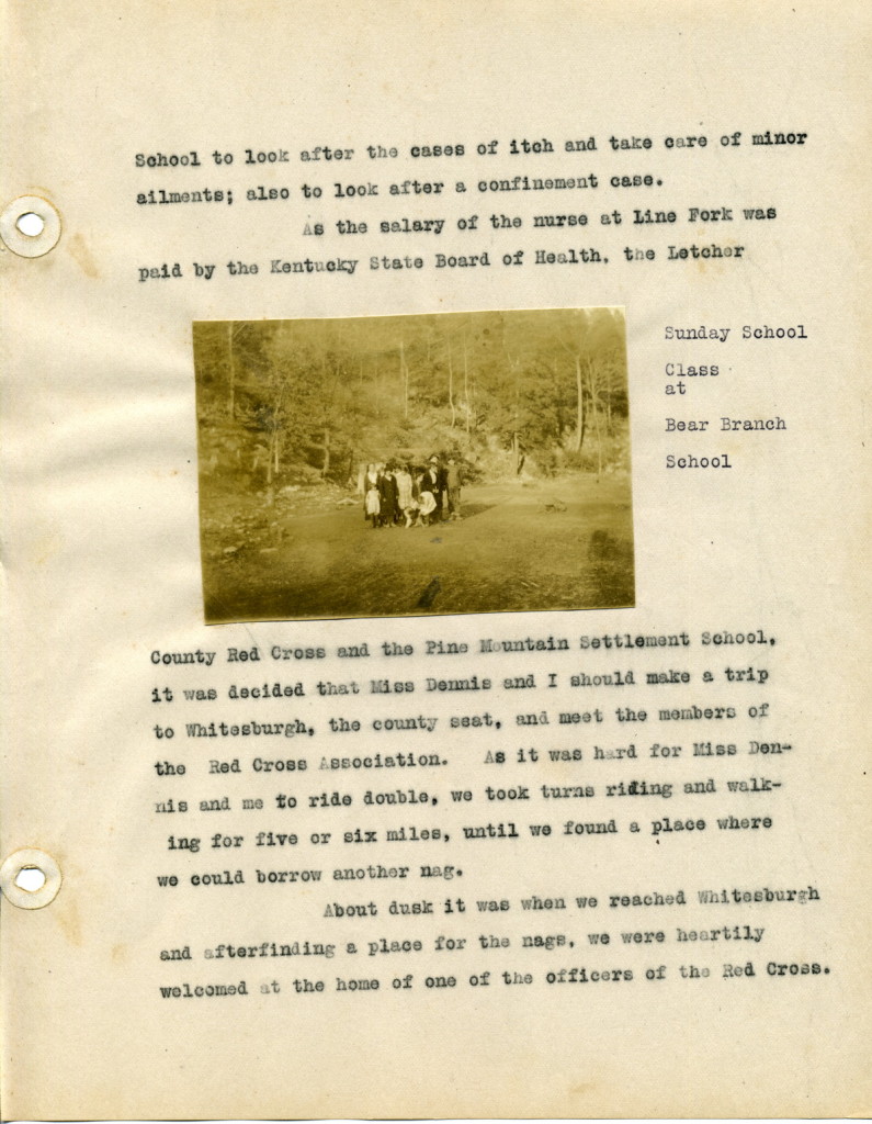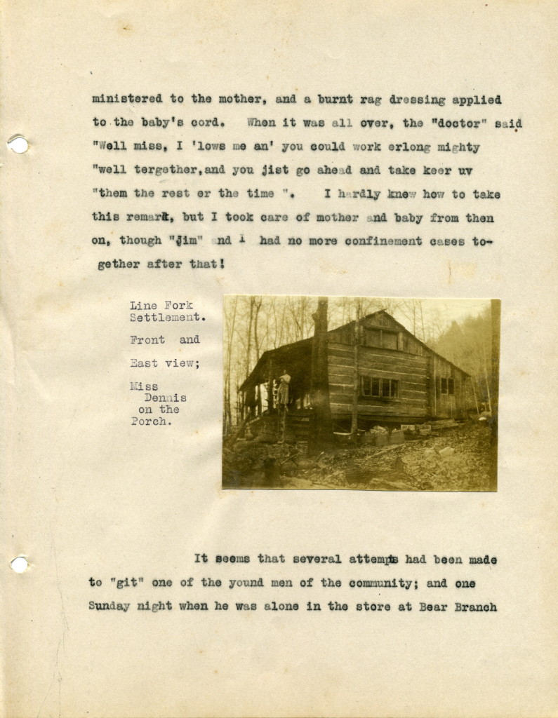 [page 01] Through Miss R[uth] Dennis of Chicago, I learned of the work at Pine Mountain Settlement School, and of the new settlement that they were to start on the Line Fork, where Miss Dennis, a teacher and a nurse were to work among the people of that community.
