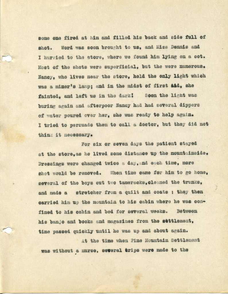 It seems that several attempts had been made to “git” one of the young men of the community; and one Sunday night when he was alone in the store at Bear Branch [page 10] some one fired at him and filled his back and side full of shot. Word was soon brought to us, and Miss Dennis and I hurried to the store, where we found him lying on a cot. Most of the shots were superficial, but they were numerous. Nancy, who lives near the store, held the only light which was a miner’s lamp; and in the midst of first aid she fainted, and left me in the dark! Soon the light was burning again and after poor Nancy had had several dippers of water poured over her, she was ready to help again. I tried to persuade them to call a doctor, but they did not think it necessary.