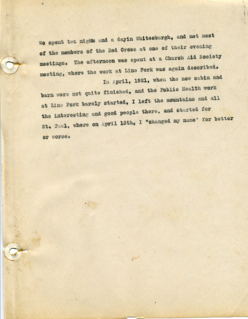 In April 1921, when the new cabin and barn were not quite finished, and the Public Health work at Line Fork barely started, I left the mountains and all the interesting and good people there, and started for St. Paul, where on April 13th, I “changed my name” for better or worse.