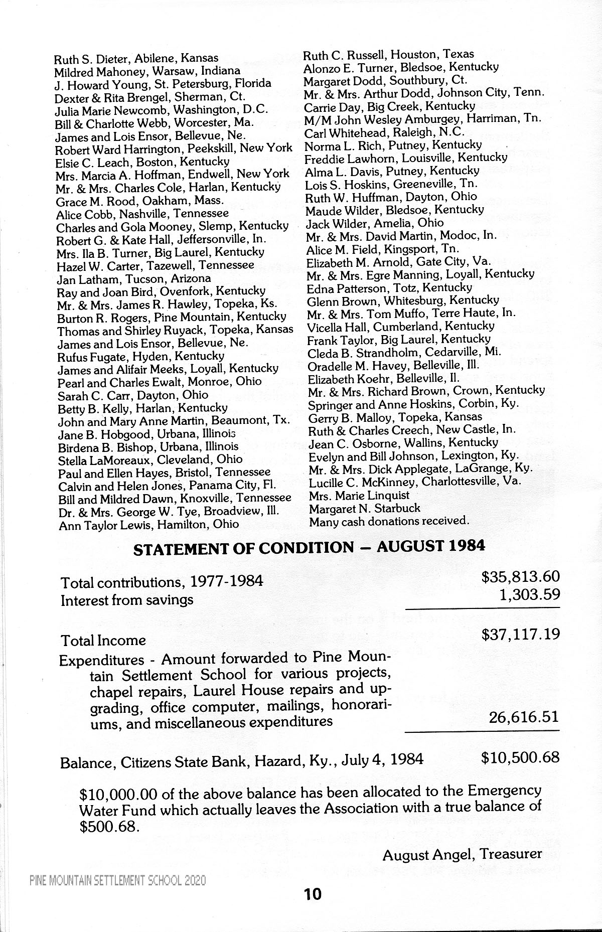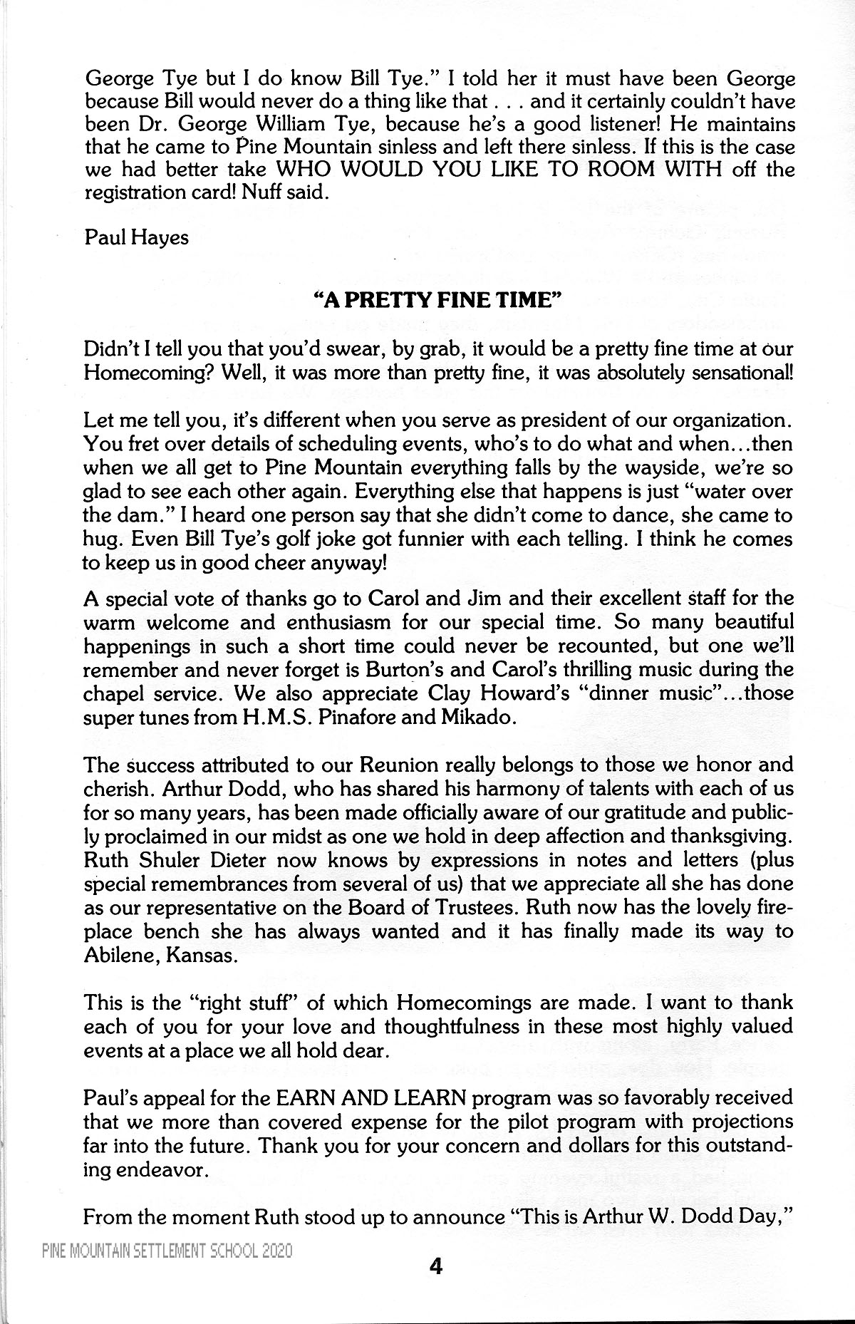 The benefits we are all deriving from Pine Mountain have been reflex, because as we have received, we are now giving back to the school. I am aware that my work to serve you was not done alone, but with the constant endeavors from you as a whole, and especially Ellen and Paul Hayes, who have really guided me in your behalf for the past six years.