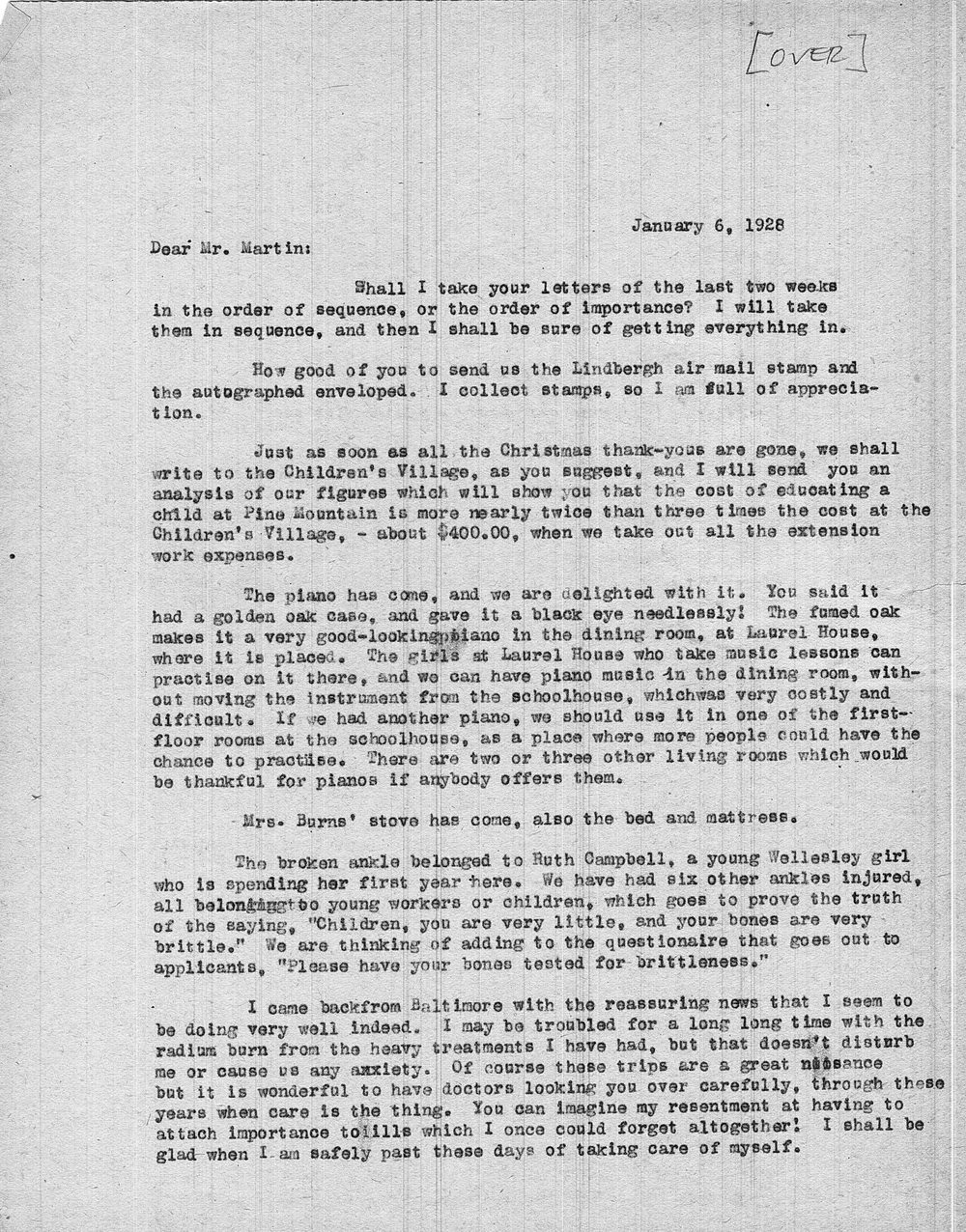 Martin was an avid correspondent. As President of the Board of Trustees at Pine Mountain, he kept a close eye on the School and was very generous with both his time and his money for the School. The following images are samples of his letters to and from Pine Mountain staff in 1928. (Go to DARWIN D. MARTIN 1928 Correspondence for a listing of the contents of each of these letters.)