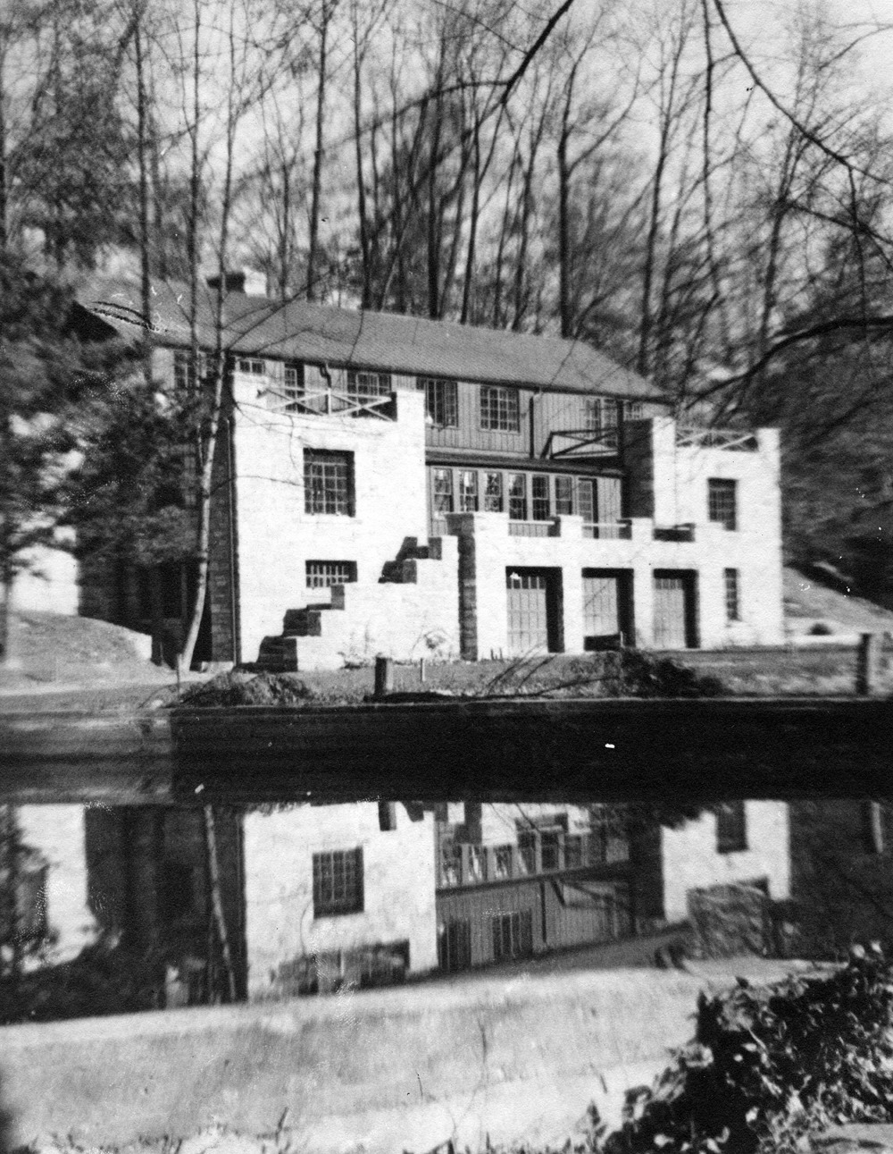 - Original appearance of the Jesse Preston Draper Industrial Building, reflected in the swimming pool, c. 1937.[II_6_swimming_draper_boys_239a]