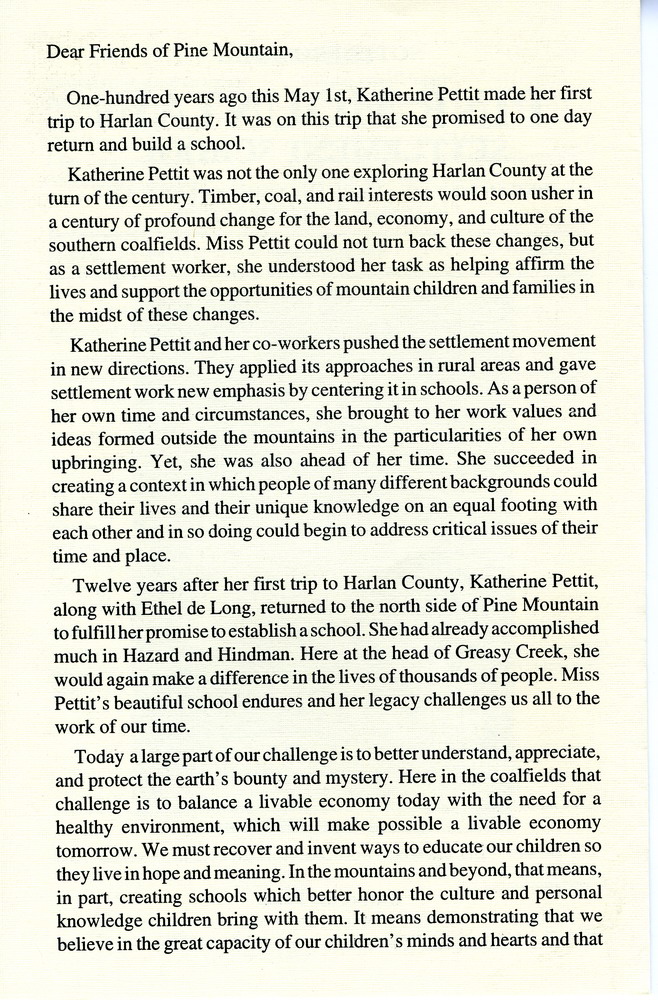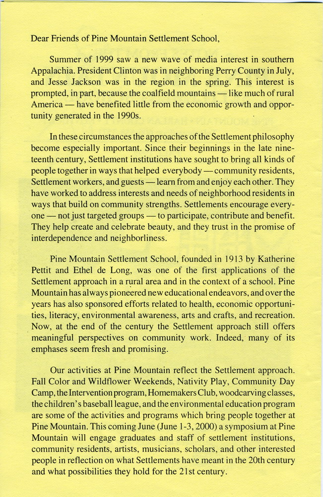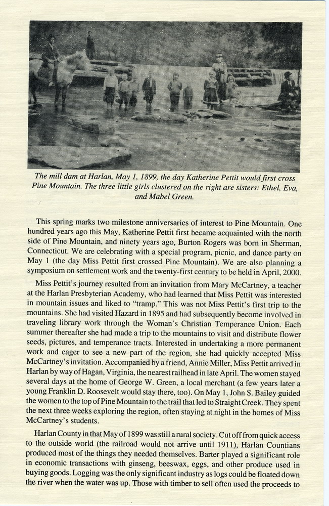 [insert] 100th anniversary ; Katherine Pettit ; Burton Rogers ; symposium ; Mary McCartney ; Annie Miller ; George W. Green ; John S. Bailey ; Harlan County ; history ; early schools ; Hindman Settlement School ;