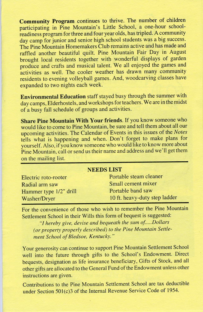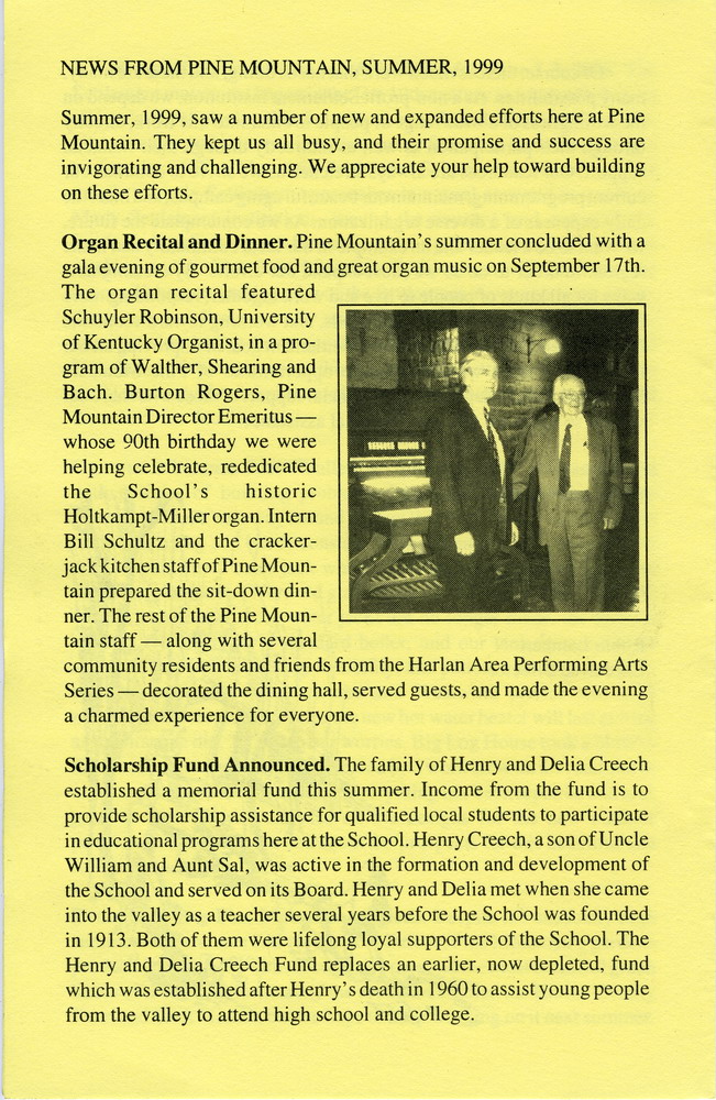 NOTES – 1999 FALL: organ ; recital ; Schuyler Robinson ; Burton Rogers ; Holtkampt-Miller organ ; Bill Schultz ; scholarship fund ; Creech family ; Henry Creech ; Delia Creech ; Henry and Delia Creech Fund ; Intervention program ; Day Camp ; Community Day Camp ; Environmental Education ; Pat Begley ; crafts ; Randy Wilson ; artist-in-residence ; Elderhostel ; Intergenerational ; Symposium on Settlements ; water jack ; West Wind ; Big Log ; outdoor pavilion ; gardens ; drought ; community program ; will form ; photograph ;
