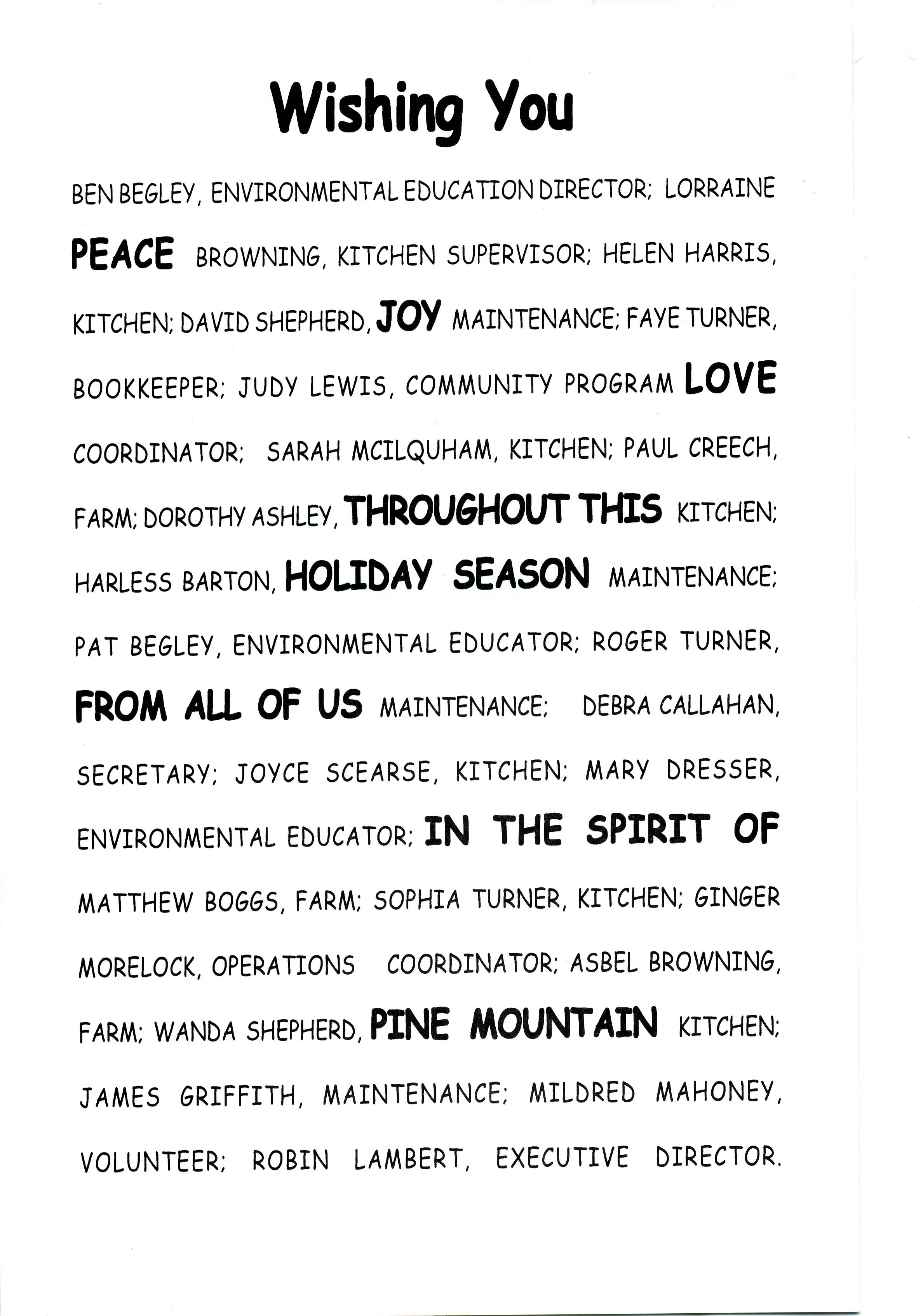 NOTES – 1999 WINTER: holiday greetings ; PMSS staff ; Ben Begley ; Lorraine Browning ; Helen Harris ; David Shepherd ; Faye Turner ; Judy Lewis ; Sarah McIlquham ; Paul Creech ; Dorothy Ashley ; Harless Barton ; Pat Begley ; Roger Turner ; Debra Callahan ; Joyce Scearse ; Mary Dresser ; Matthew Boggs ; Sophia Turner ; Ginger Morelock ; Asbel Browning ; Wanda Shepherd ; James Griffith ; Mildred Mahoney ; Robin Lambert ; Richard Albin ; dulcimers ; artist-in-residence ; Pauline Boggs ; Green Hills ; concert ; Chapel ; oral history project ; programs ; Nativity Play ; Trustees list ; photographs ; drawings ;