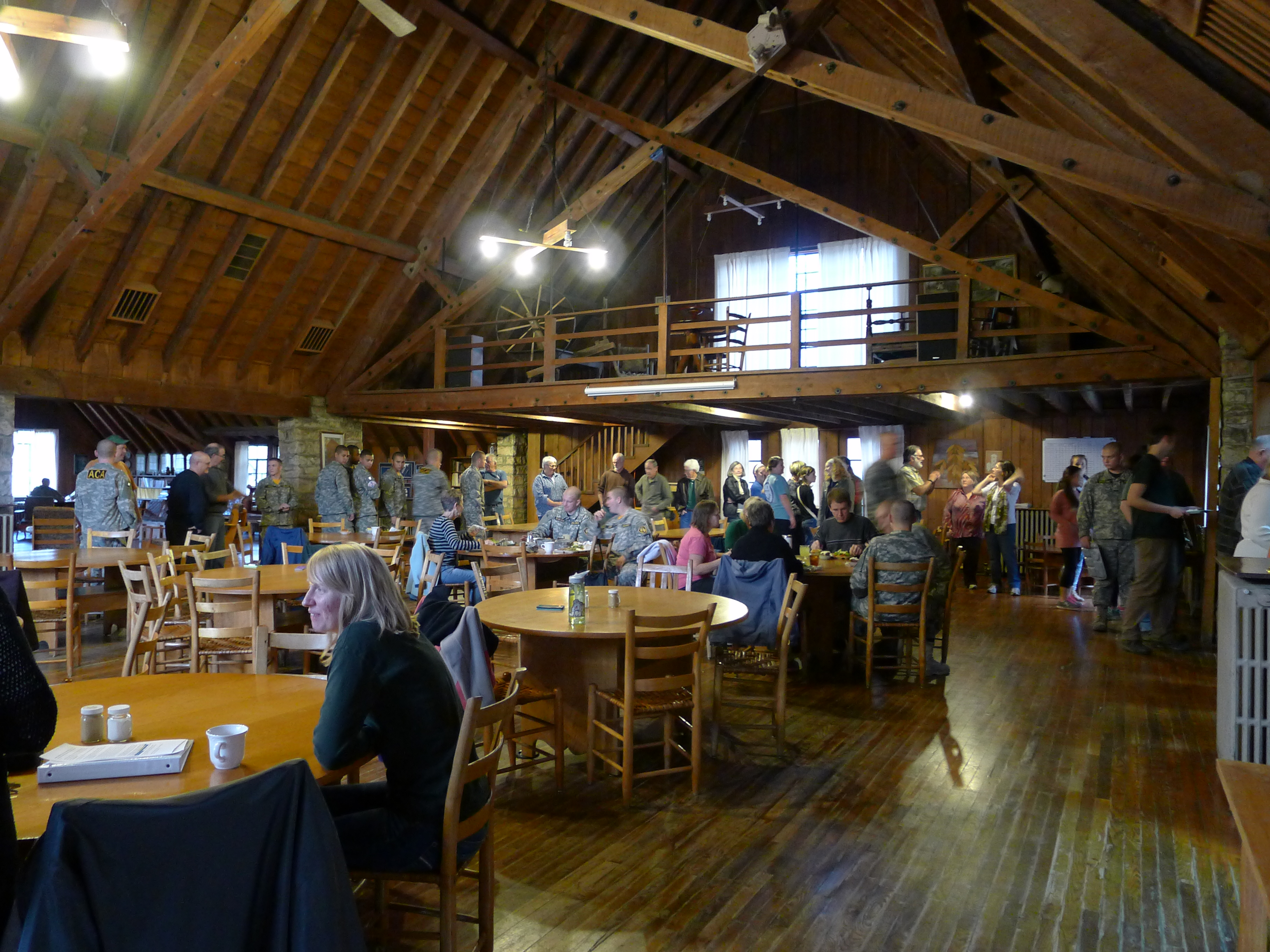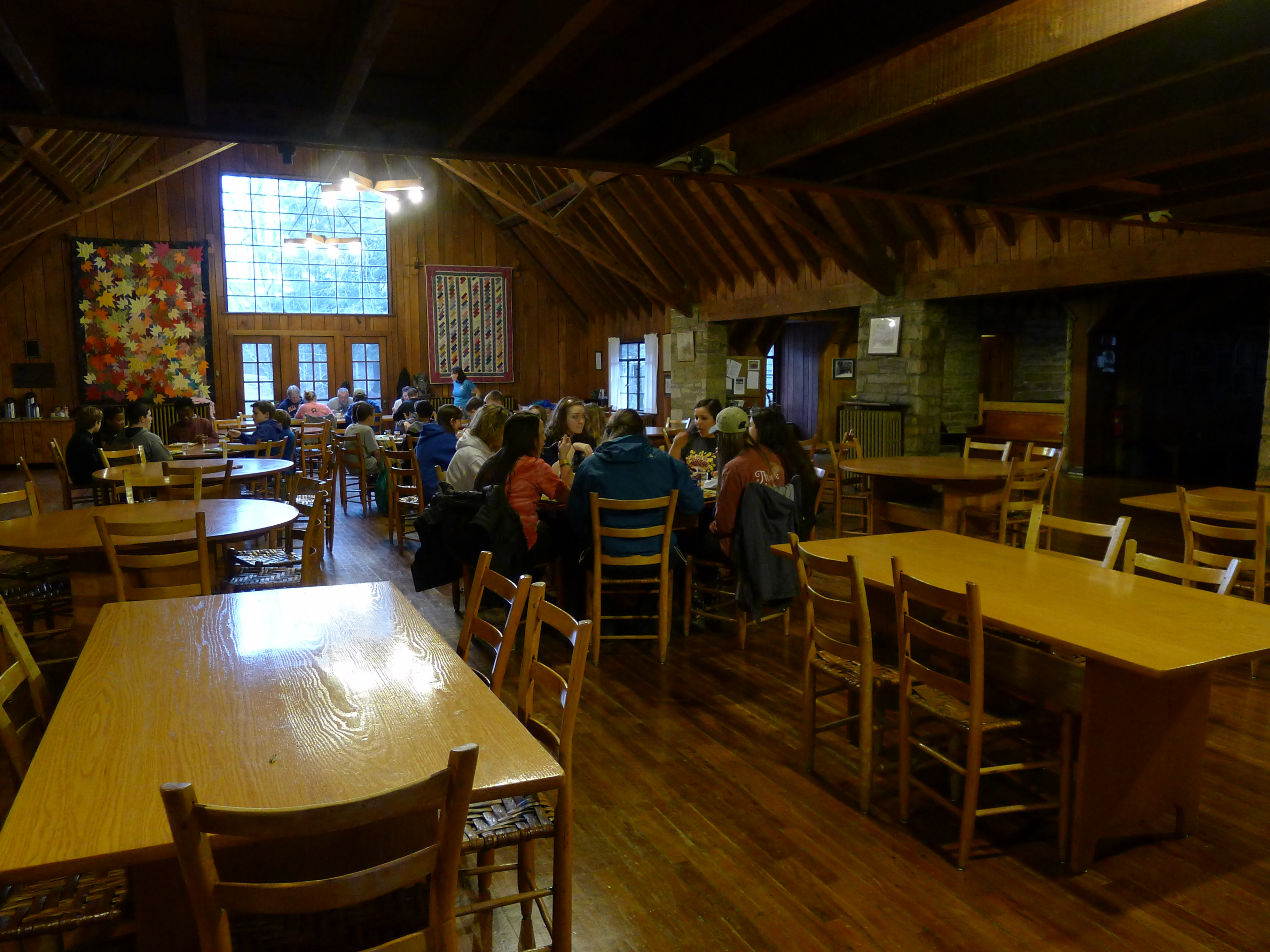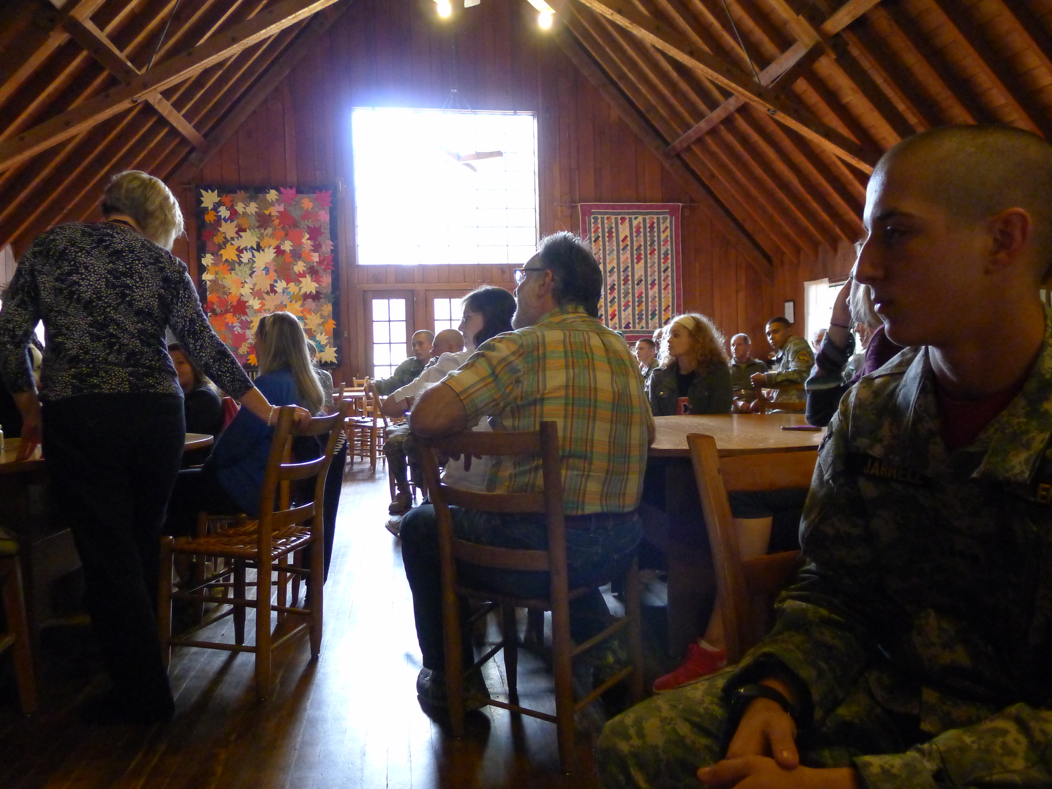 James Madison Alpha Sigma Tau volunteers dine together at Laurel House, 2015. [P1060992.jpg]