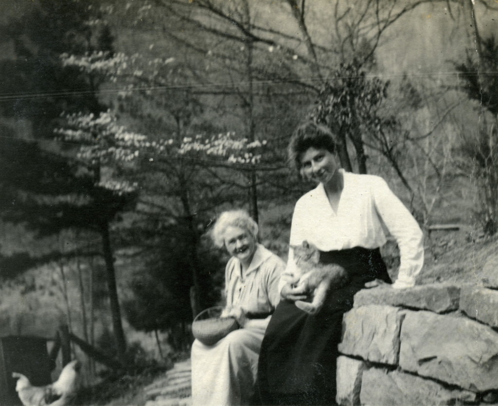 Harriet Butler, nurse and Dr. Grace Huse with cat at Big Laurel. [X_099_workers_2497b_mod.jpg]