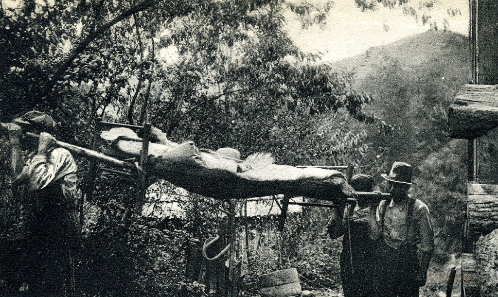 “Carrying sick person to railway. 18 Mile trail [to Laden], Pine Mountain, Ky. “[kingman_010a]