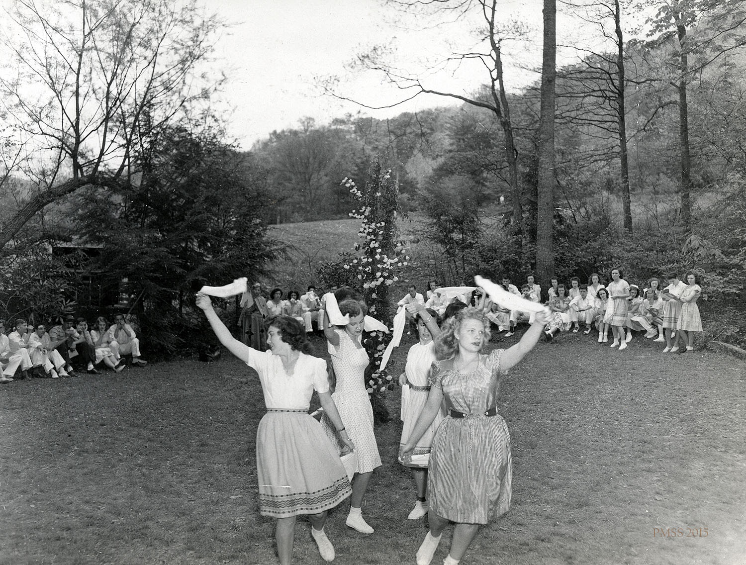 - 1945 May Day on the Dancing Green. Students and “Handkerchief Dance.” Arthur W. Dodd Album. [dodd_A_051_mod.jpg]