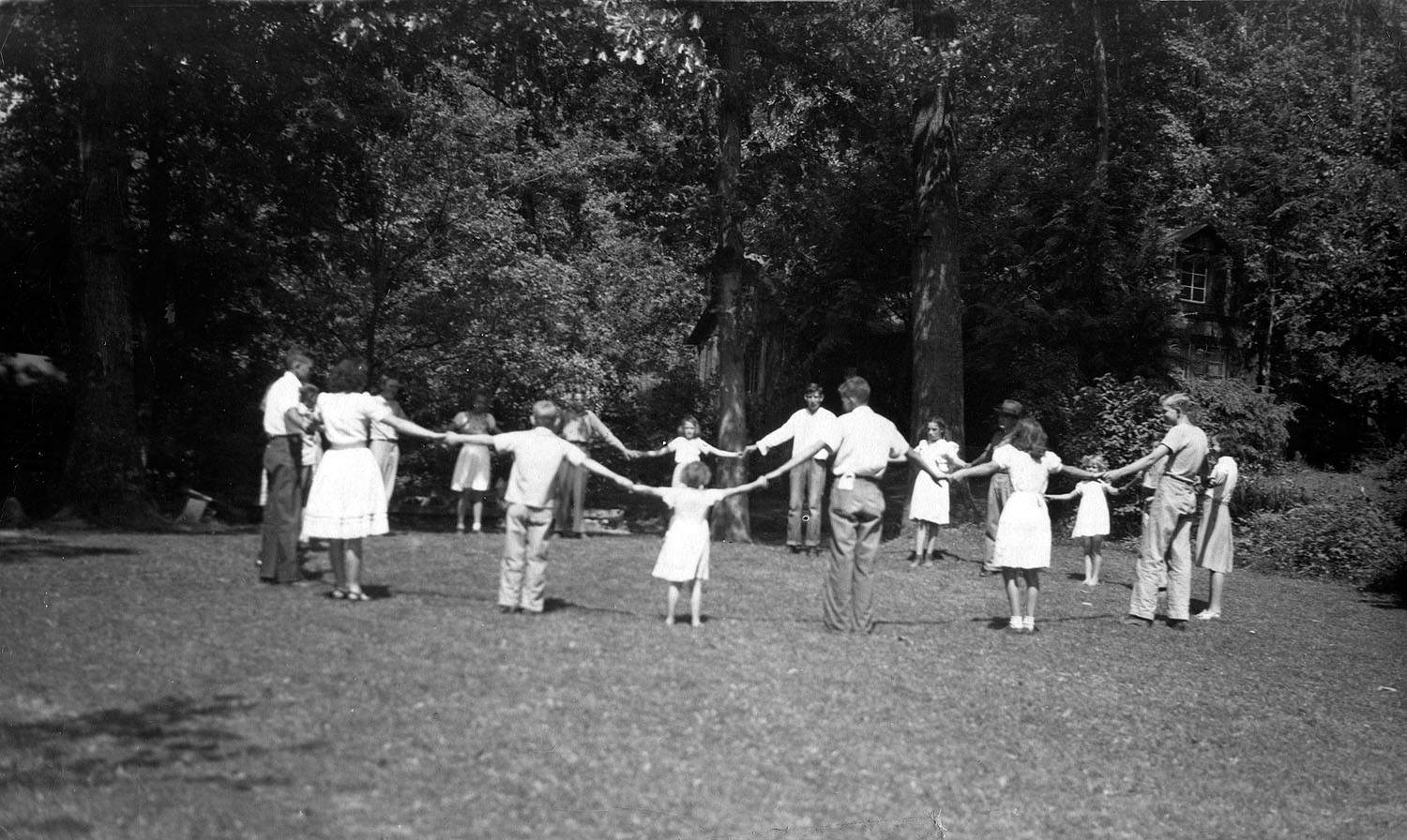 - Lutrella Baker Album. Line Fork Settlement, 1937-41. Circle dance with community at Cabin lawn. [line_fork_005c.jpg]