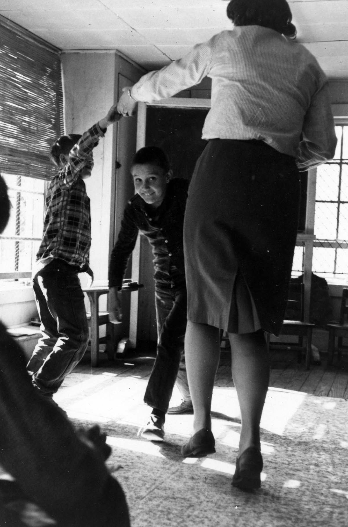 - 1810b Mrs. Whitaker and two students dancing with girl and boy watching. 58_Life and Work_Children and Classes_028