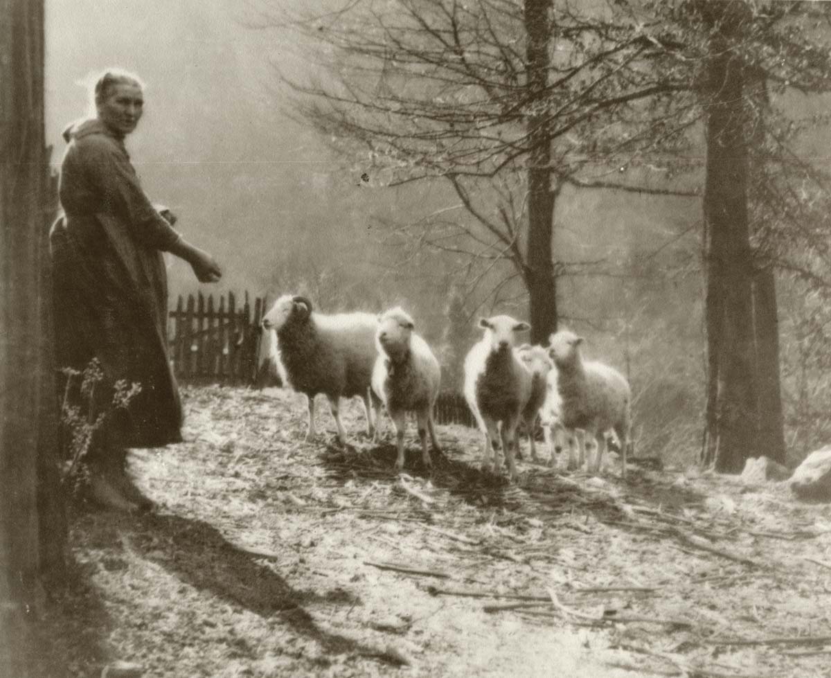 “‘Aunt Jude’ Turner, Big Laurel, about 1925” feeding sheep. [nace_II_album_010.jpg]