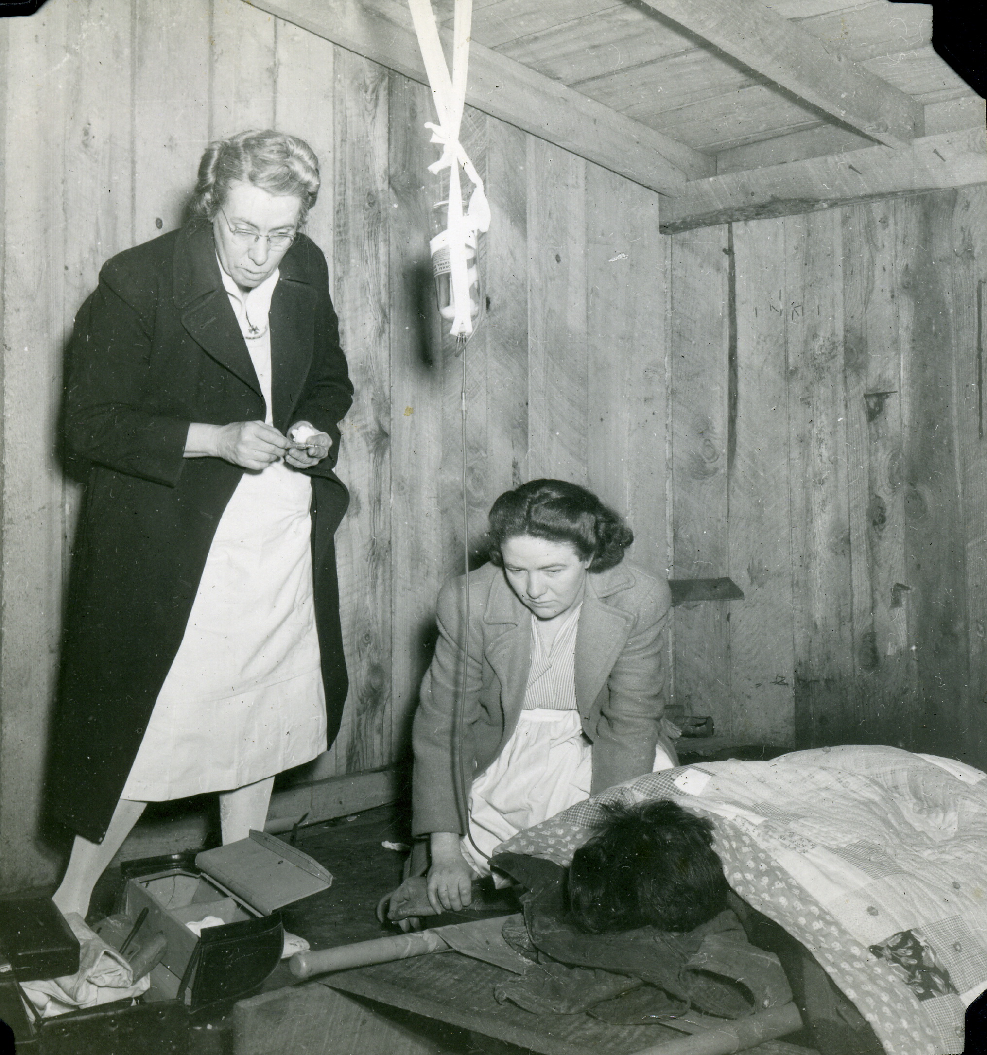 - Grace Rood (lft) with Dr. Elizabeth Henderson (rt) and patient on litter. Grace Rood Album. [rood_038.jpg}