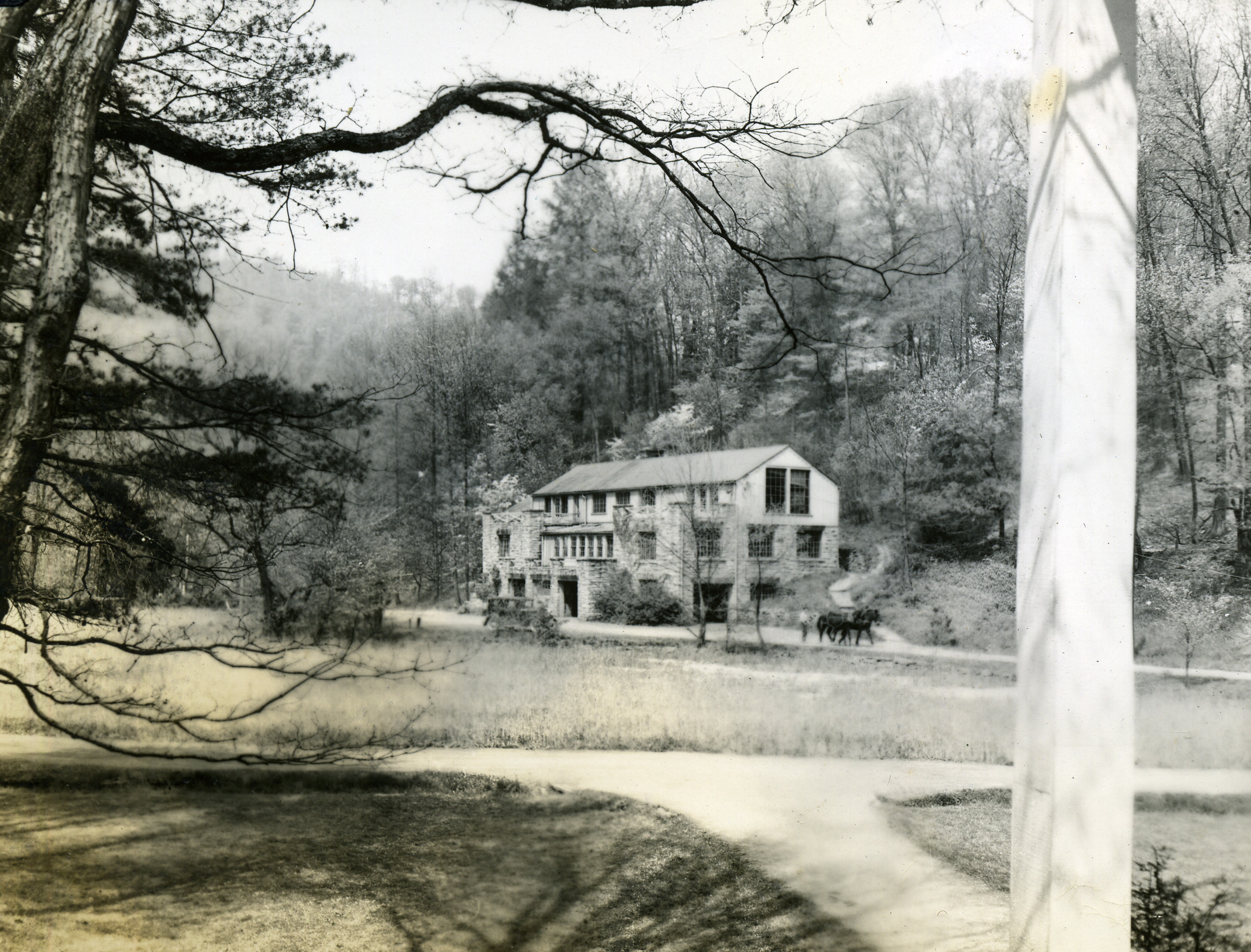 - Plowing field with mules in front of Laurel House. Grace Rood Album.