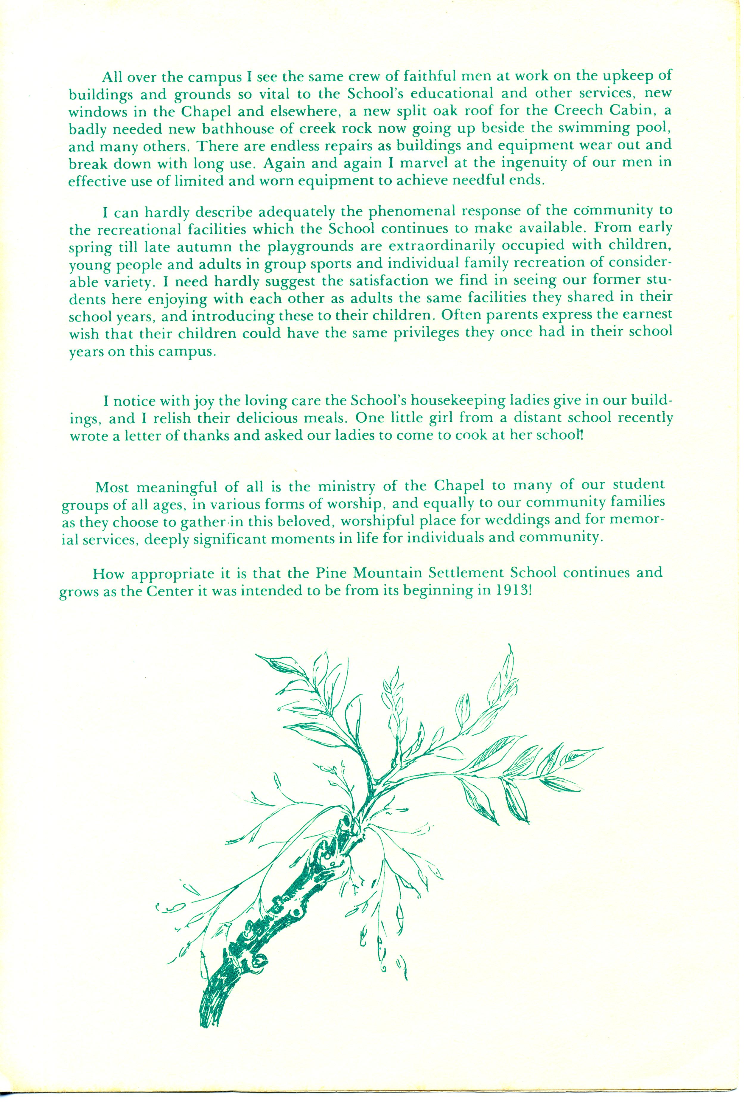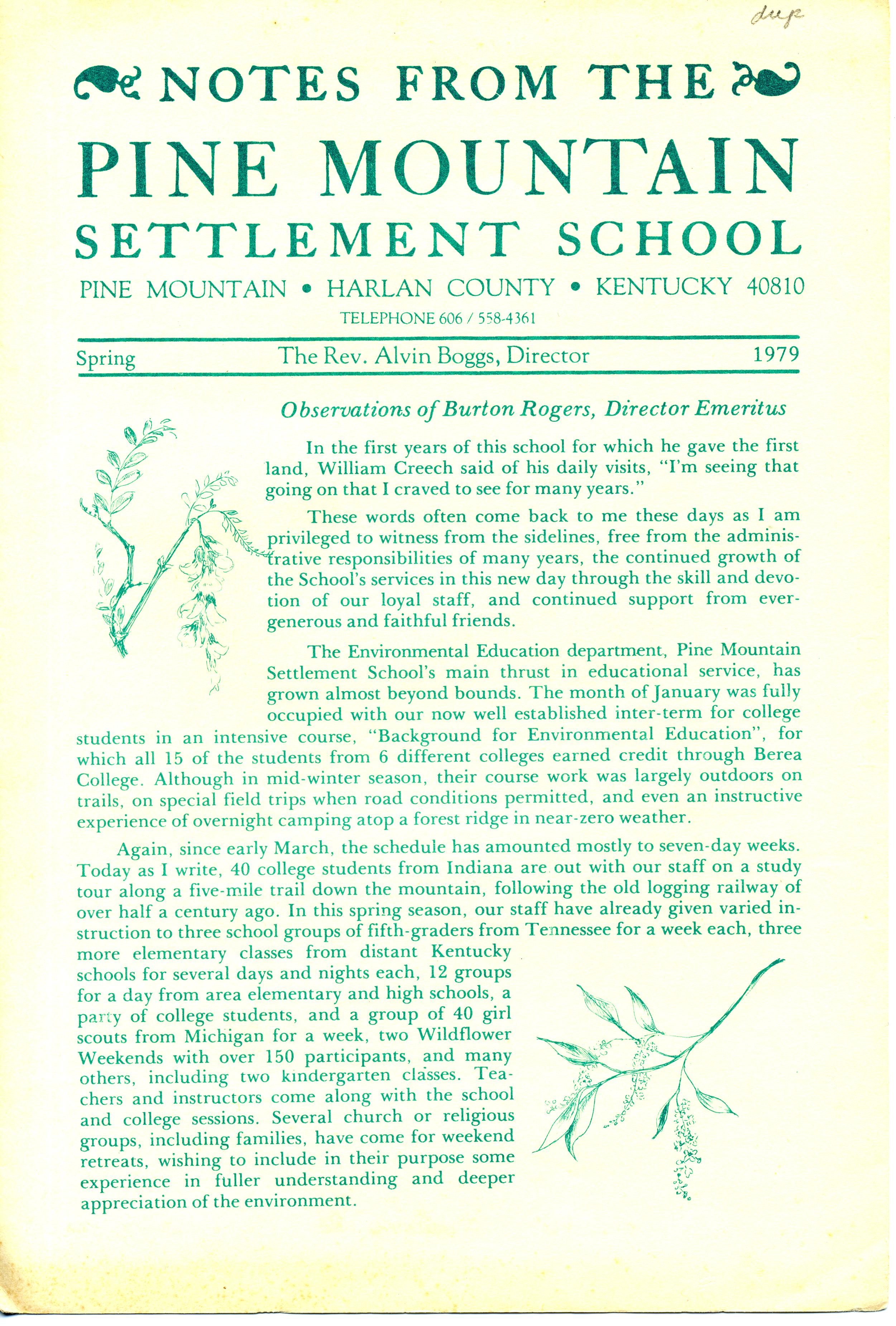 NOTES – 1979 SPRING: Burton Rogers ; Environmental Education ; college courses ; school groups ; curriculum ; astronomy ; medical service ; clinic ; Frontier Nursing Service ; Infirmary ; nurse ; community clinic committee ; community service ; director ; cattle ; sheep ; Spinning Bee ; upkeep ; bathhouse ; playground ; Chapel ; drawings ;