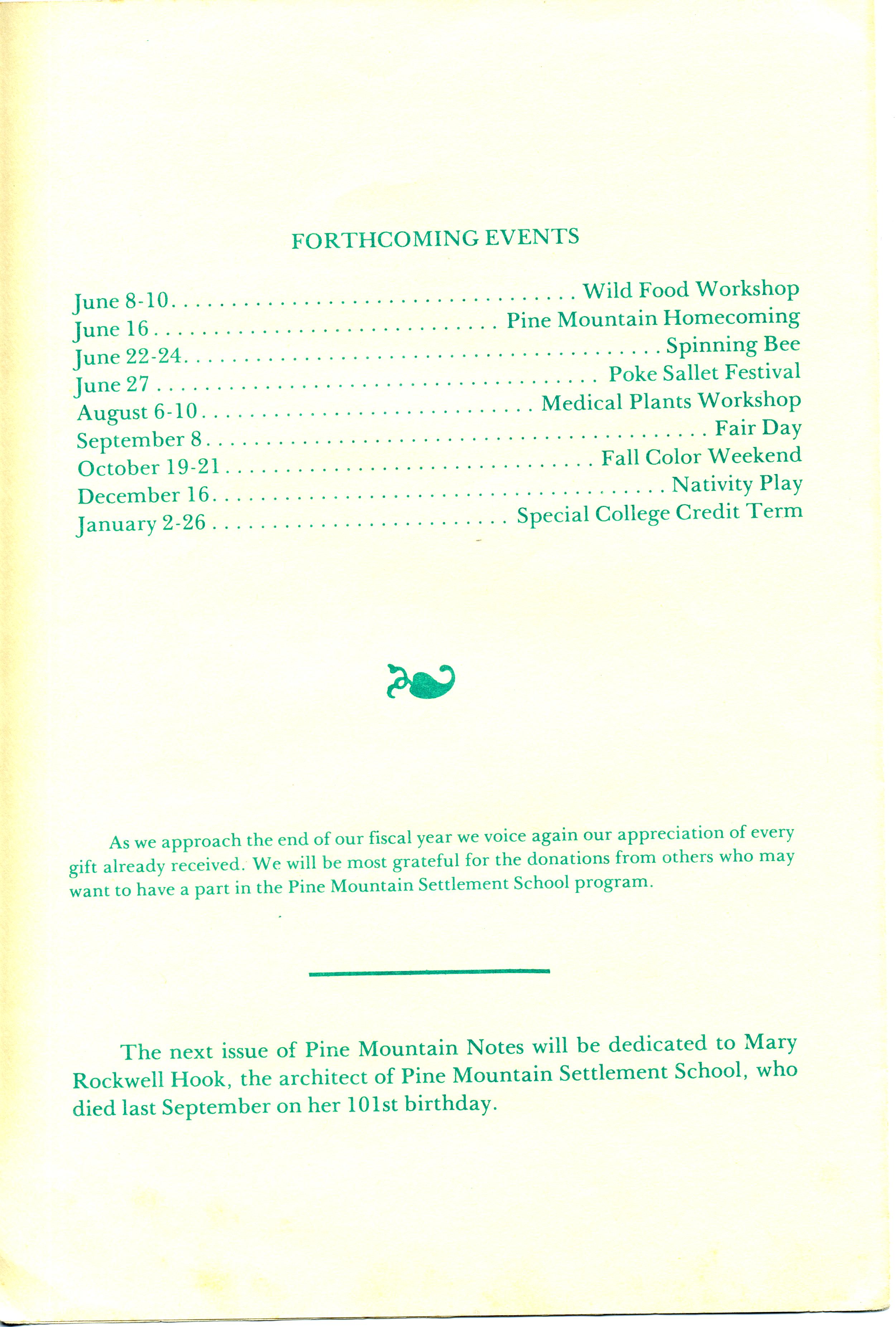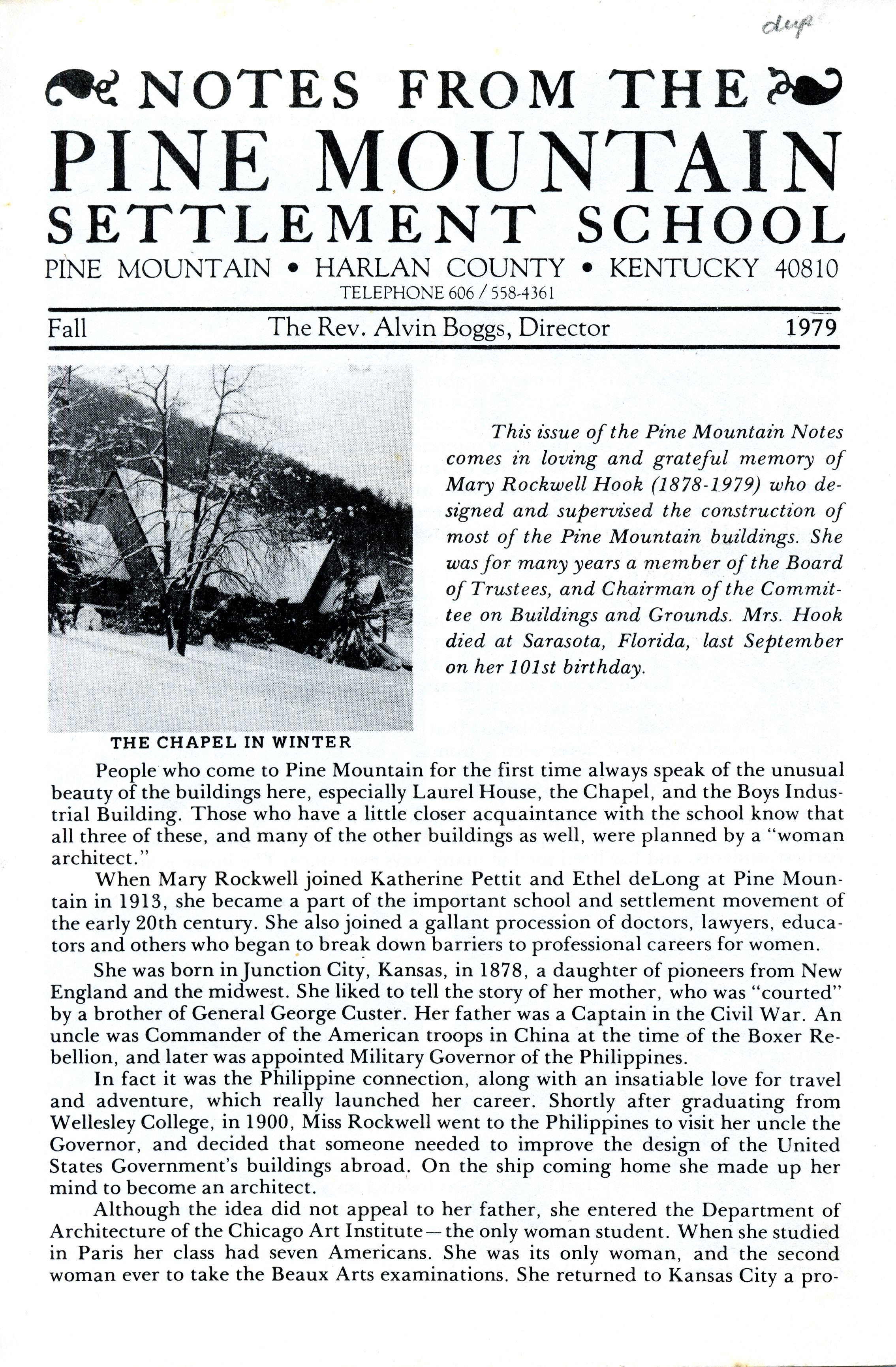 This issue of the Pine Mountain Notes comes in loving and grateful memory of Mary Rockwell Hook (1878-1979), who designed and supervised the construction of most of the Pine Mountain buildings.