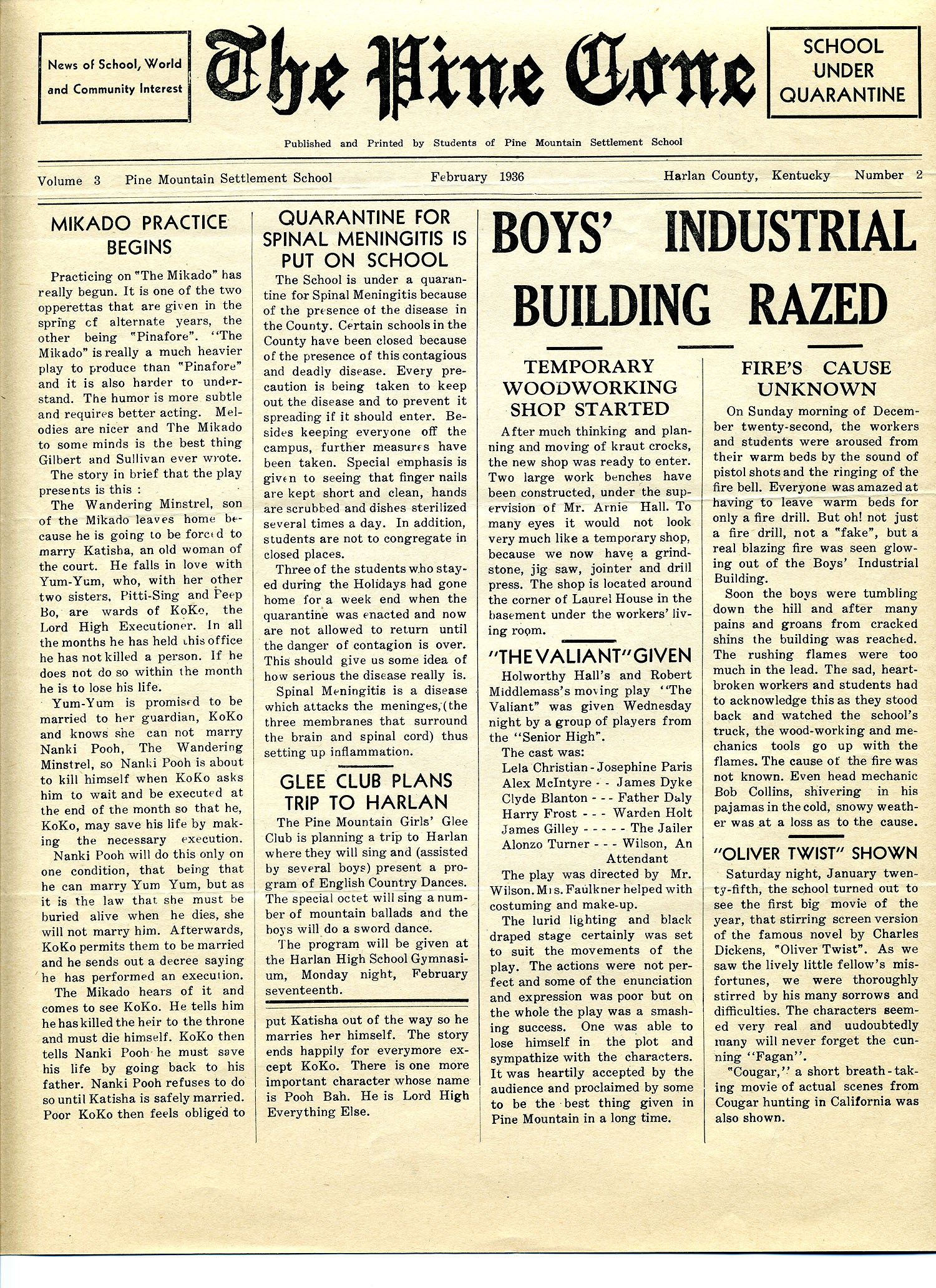 The Mikado ; spinal meningitis quarantine ; Glee Club ; Boy’s Industrial Building razed ; temporary woodworking shop ; Oliver Twist movie ;