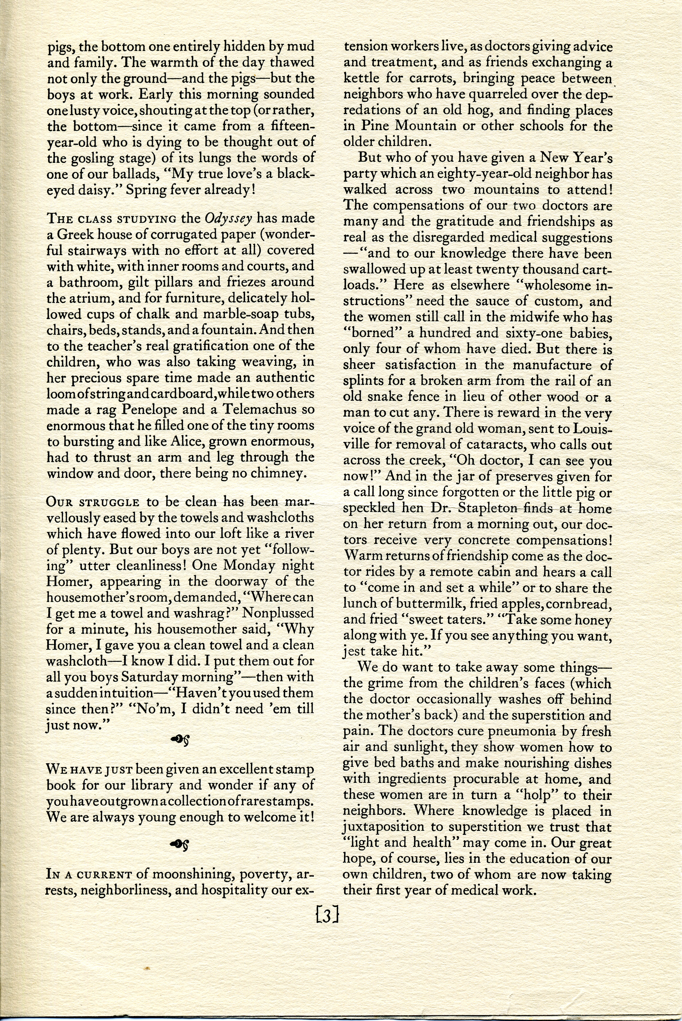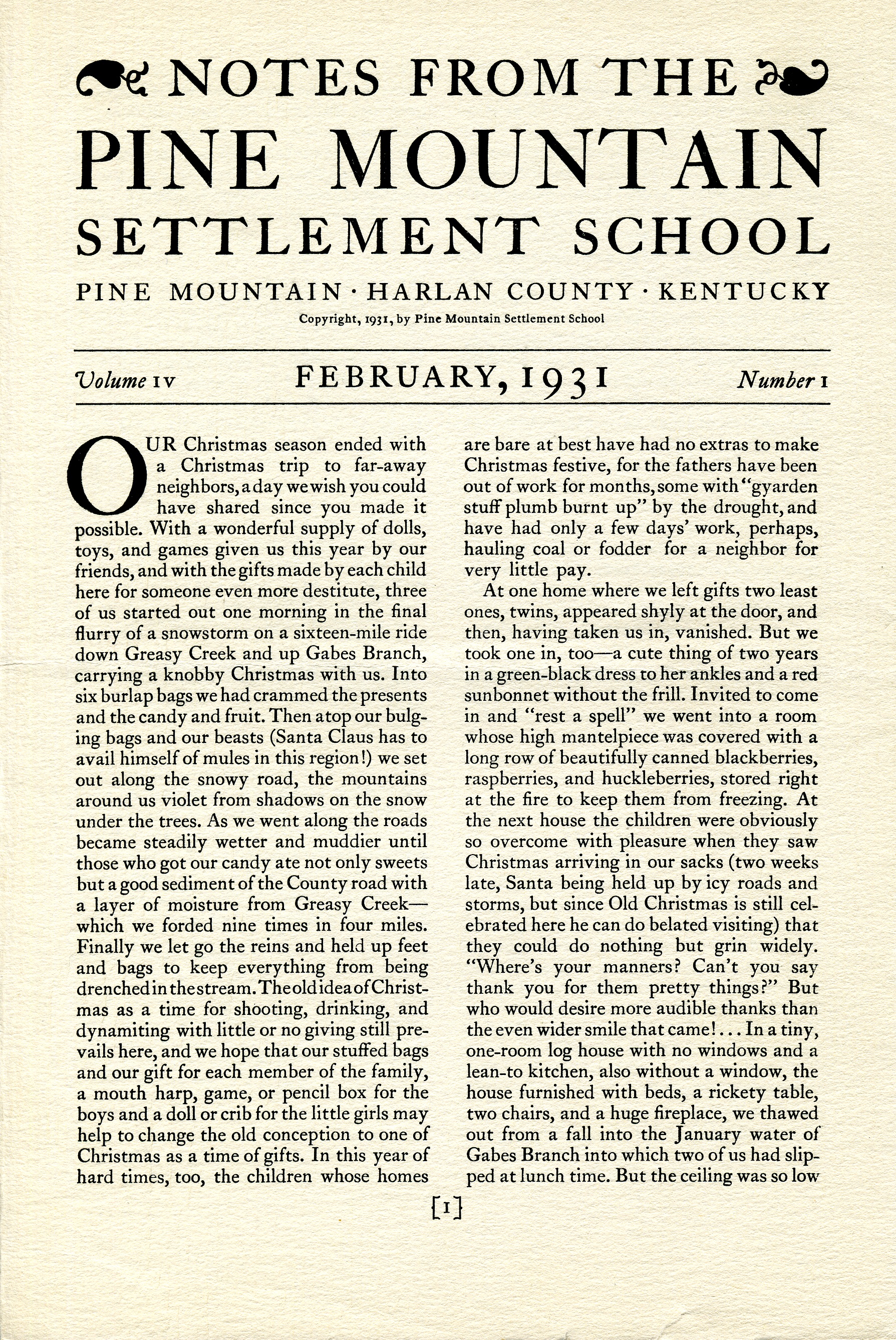 NOTES – 1931 FEBRUARY: distributing Christmas gifts to community ; Nativity Play ; poem ; Christmas decorations ; spring in January ; landscaping ; the family ; student obligations ; week-day schedule ; religious life ; home life ; industrial training ; academic ideals ; medical program ; recreation ; extension work ; overview of buildings ; Greek house ; cleanliness ; stamp book ; extension workers ; doctors ; Daniel M. Lord ; parties ; property room ; charades ; stunts ; plays ;