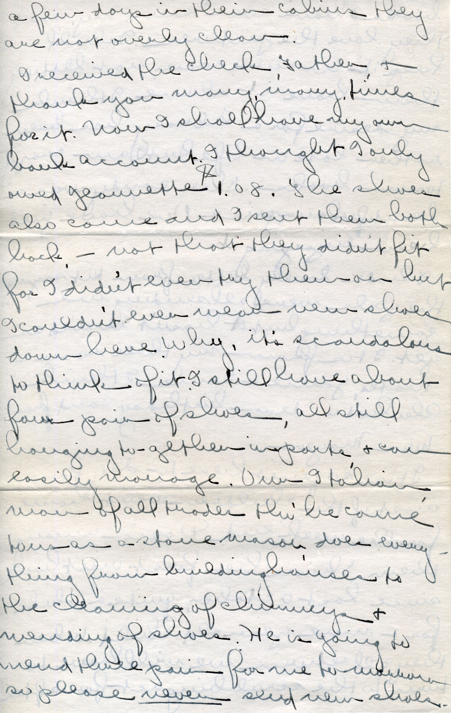 I received the check, Father, and thank you many, many times for it. Now I shall have my own bank account. I thought I only owed Jeanette $1.08. The shoes also came and I sent them both back ~ not that they didn’t fit for I didn’t even try them on but I couldn’t ever wear new shoes down here. Why, it’s scandalous to think of it. I still have about four pair of shoes, all still hanging together in parts, and can easily manage. Our Italian man of all trades tho’ he came to us as a stone mason does everything from building houses to the cleaning of chimneys and mending of shoes. He is going to mend three pair for me tomorrow, so please never send new shoes. I am so glad to get the crochet needle. I still want laundry bag, handkerchiefs, “1914” red song book, new nightgowns hurried along for it is getting mighty warm, box of talcum powder, tube of Kolyna’s tooth paste and I think I had better have a couple of gauze shirts. My supply is down to four. Do you think my wants never cease but you see when you live in a wilderness away from all markets you are still bound to have some wants.