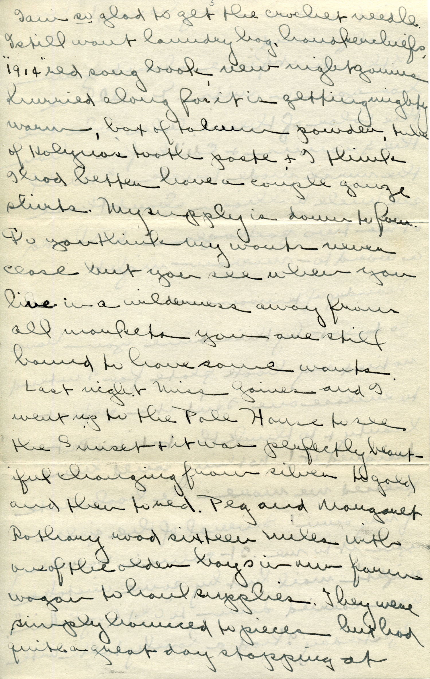 Last night Miss Gains and I went up to the Pole House to see the sunset and it was perfectly beautiful changing from silver to gold and then to red. Peg and Margaret Rothary [teacher] rode sixteen miles with one of the older boys in our farm wagon to haul supplies. They were simply bounced to pieces but had quite a great day stopping at mill on their way home to have meal ground.