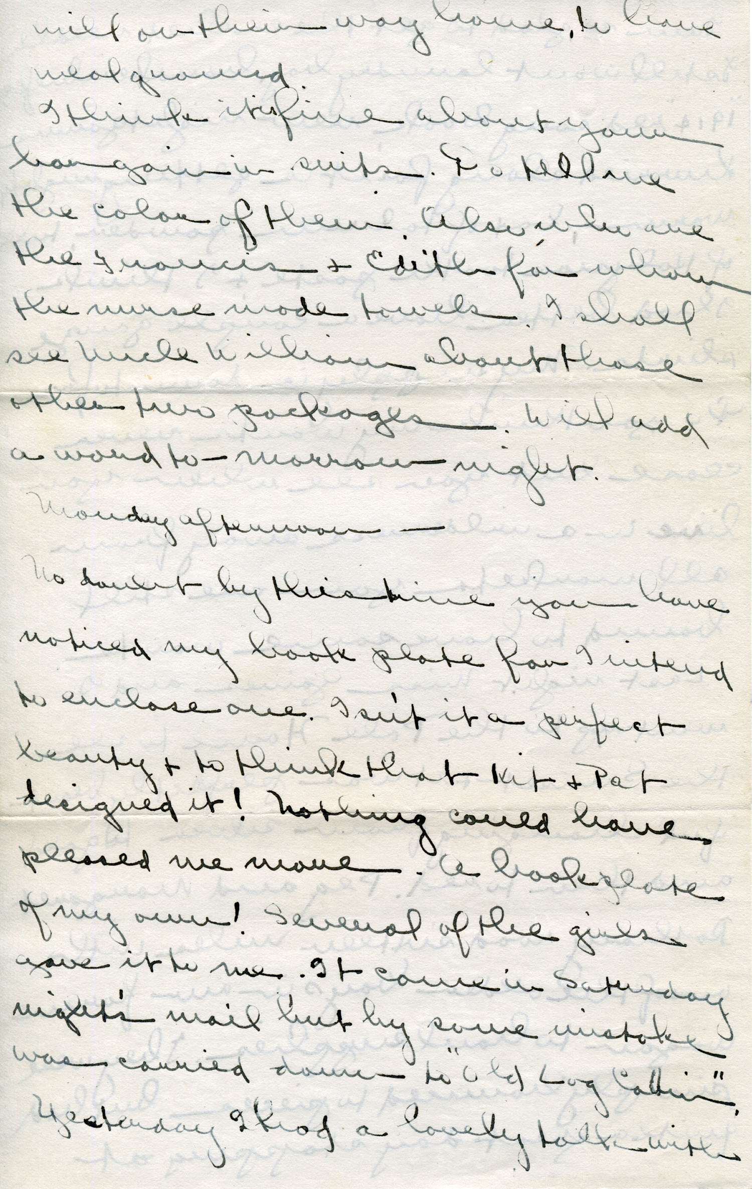 No doubt by this time you have noticed my book plate for I intend to enclose one. Isn’t it a perfect beauty and to think that Kit and Pat designed it! Nothing could have pleased me more. A bookplate of my own! Several of the girls gave it to me. It came in Saturday night’s mail but by some mistake was carried down to “Old Log Cabin“. Yesterday I had a lovely talk with Miss de Long about plans for the school for next year. You don’t know how good it makes you feel to know you have not been a failure in your first job even if you don’t receive pay! She was perfectly willing to start right now and pay me a salary which would cover my expenses for the rest of the year but I thought I would prefer volunteering my services to the school until May for at present it is in such desperate need for money. However, I shall have a salary next year sufficient to be absolutely independent. I can hardly wait, and then won’t I chuckle over Jeanette. No matter how small the salary it is almost pure gain for our expenses are almost nothing. I have spent hardly $2.50 since Christmas.