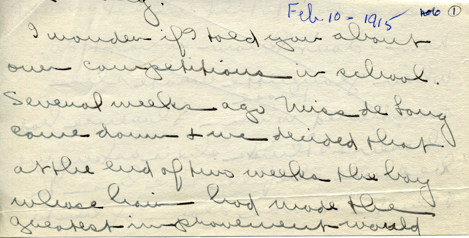 2.    1915 LETTER 2 – February 10, 1915 – “Dear Family — I wonder if I told you about our competitions” [images 004-011]